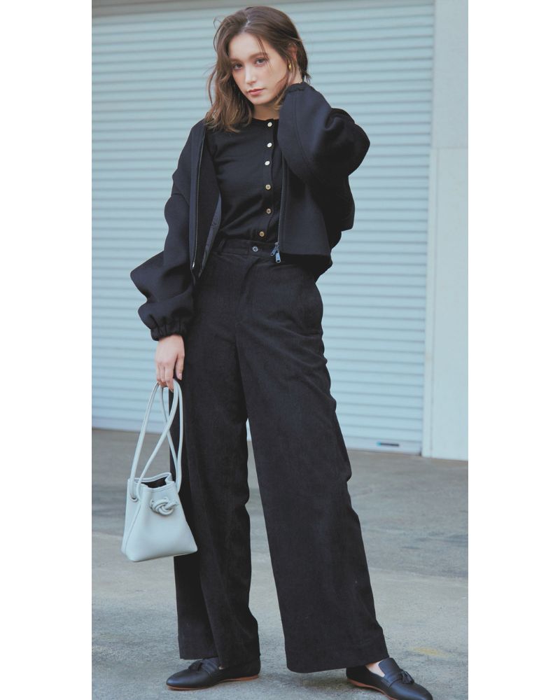 2月20日(木)、無難だからと頼りがちなオール黒コーデは、ともすればほっこり重たく見える可能性も…。そんな時は異素材MIXを意識すると、着こなしにリズムが付きグッとあか抜けた印象に刷新します。冬らしさが漂うコーデュロイパンツやメルトン素材のジャケットで、重厚感あるリッチな佇まいに。足元はレザー調のローファーを取り入れて緩急を付ければ、スタイリッシュに仕上がります。