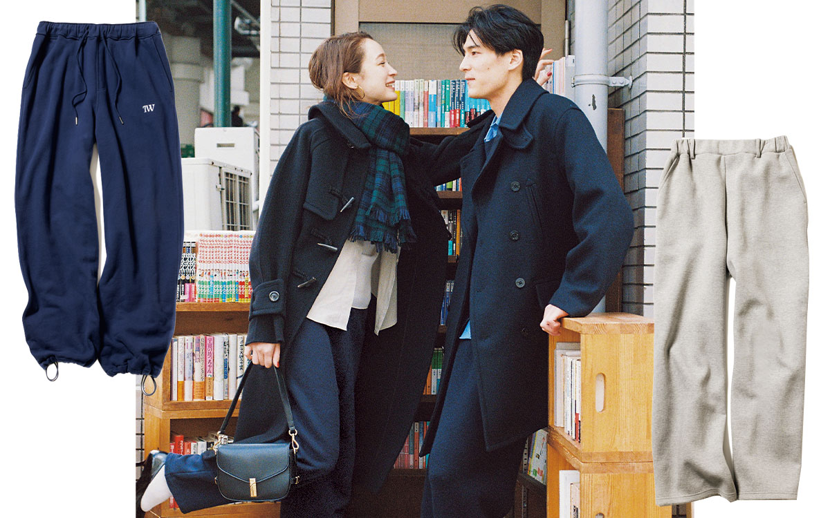 裾に絞りがないスラックス型&ネイビーなら平日のキレイめ服からの移行もスムーズ。スウェットの質感が、普段通りのテンションのおしゃれに週末らしいリラックス感を添えてくれます。ダッフルコート¥143,000(ラム・シェ/ブランドニュース)シャツ¥24,200(カルバン・クライン/カルバン・クライン カスタマーサービス)タートルニット¥14,300(ストラ)スウェットパンツ¥29,700(シー/エスストア)マフラー¥30,800(ウールリッチ/ウールリッチ 二子玉川店)イヤリング¥3,190(ミミサンジュウサン/サンポークリエイト)バッグ¥13,900(チャールズ&キース/チャールズ&キース ジャパン)ソックス¥990(靴下屋/タビオ)パンプス¥9,900(チャールズ&キース/チャールズ&キース ジャパン)【MENS】コート¥108,900(ブラームスルーツストック/ワンダリズム)ニット¥110,000、ニットパンツ¥110,000(ともにボーディ/アルファ PR)シャツ¥20,900(グラフペーパー/グラフペーパー 東京)(ボーディ/アルファ PR)シューズ¥71,500(フット・ザ・コーチャー/オーセンティック・シュー&コー)ソックス/スタイリスト私物