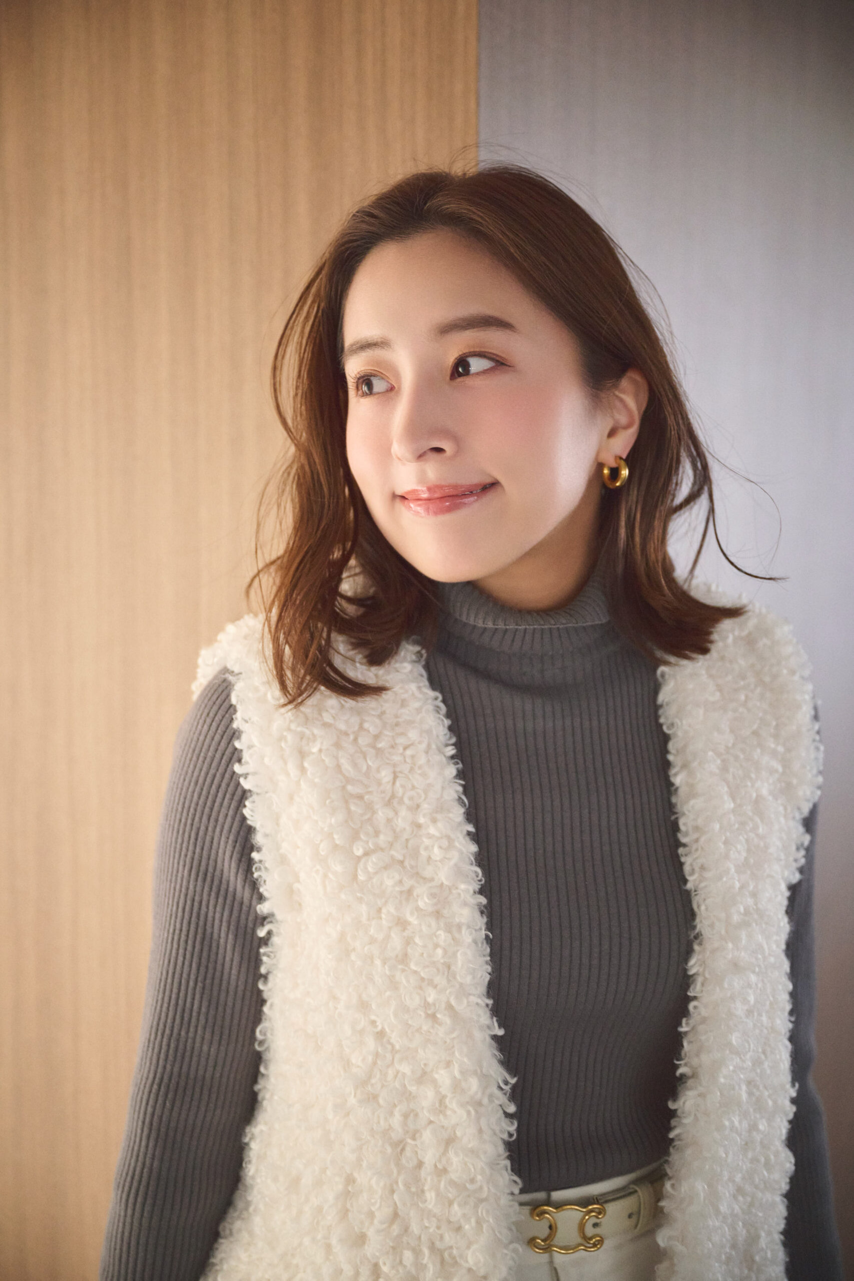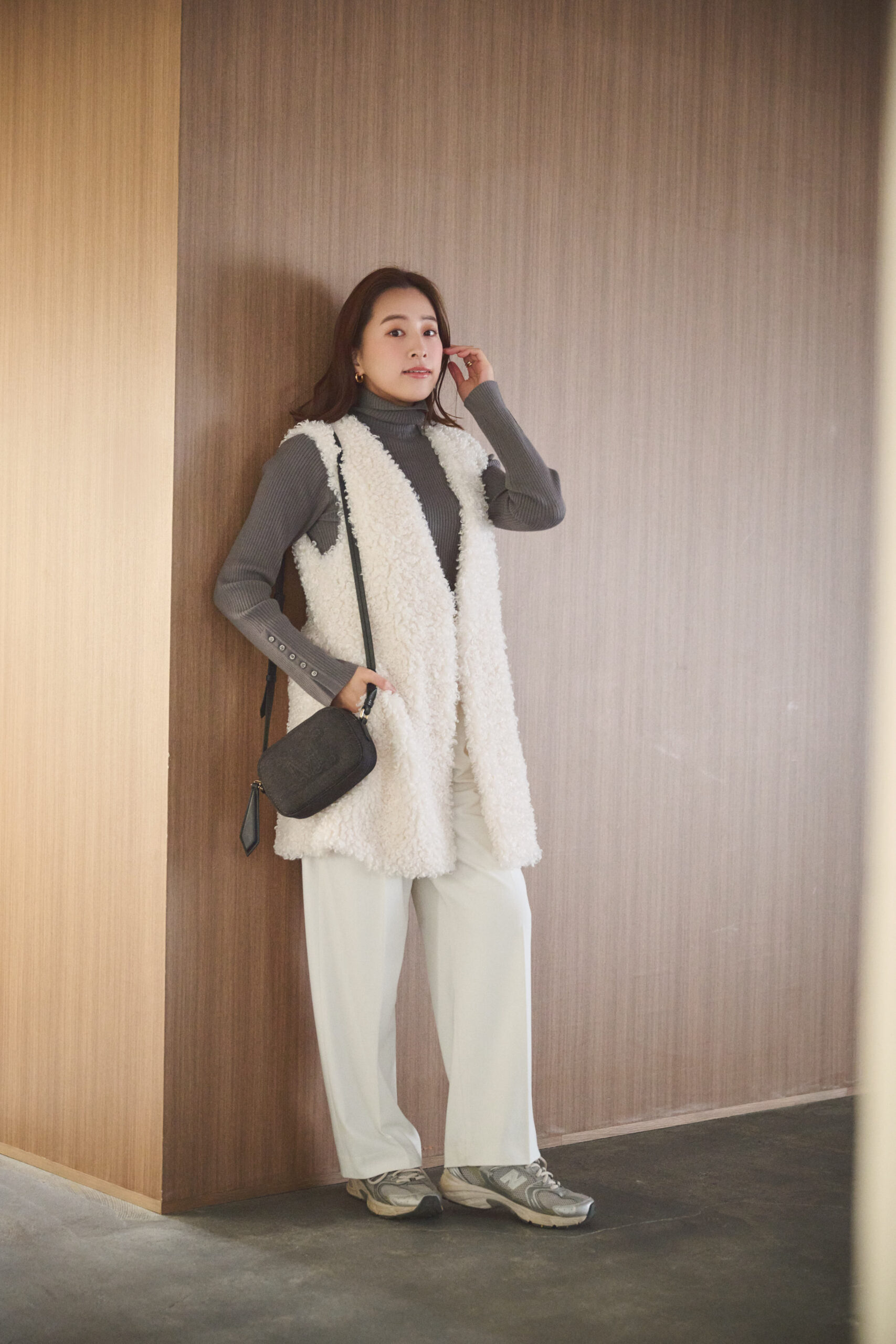 「春気分は取り入れたいけど、まだ朝夜は肌寒い日も。そんな時は、白ボアのジレが便利です!防寒もできて、重たく見えないのが嬉しい」