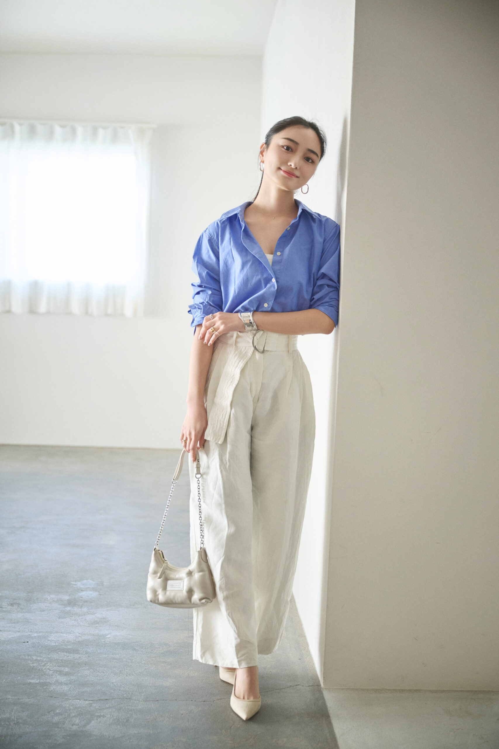「ユニクロのシャツは形がキレイで高見え。メンズっぽい色味なので、あえてジャストサイズを選んでコンパクトにするのがおすすめです」