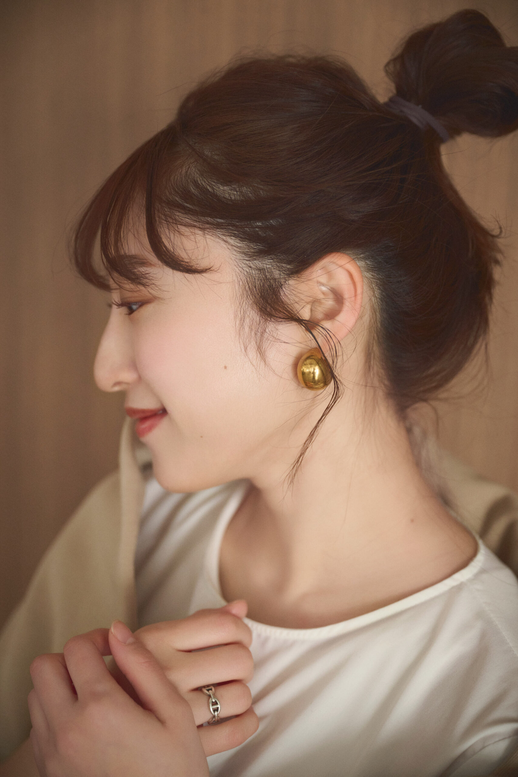 「髪をアップすることで、カジュアルさを出してバランス良く。リラクシーなのに手抜きに見えない絶妙なバランスに仕上がります。黒を封印したことで、抜け感のある優しいオシャレが完成!」