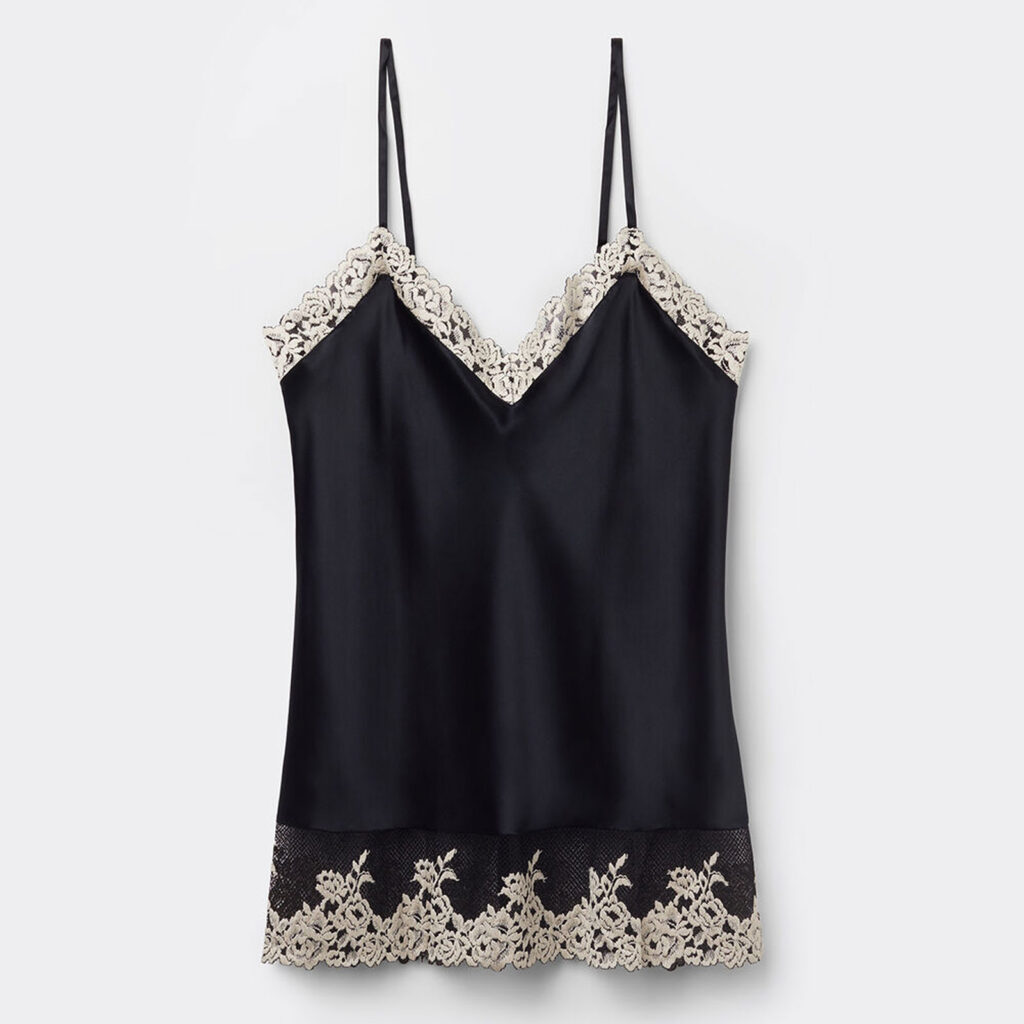 シルクサテンを使用したキャミソールは、デコルテと裾を縁どるレースが洗練された上品デザイン。華奢なストラップにもフェミニンさが宿るポイント。Pretty Flowers シルク スパゲッティストラップ トップ¥12,990(インティミッシミ/インティミッシミ 渋谷文化村通り店)ジャケット¥31,900(アルページュ ストーリー/アルページュ ストーリー プレスルーム)デニム¥30,800(ヤヌーク/カイタックインターナショナル)ピアス¥11,000 リング¥16,500 バングル¥15,400(ヴイエー ヴァンドーム青山/ヴイエー ヴァンドーム青山 有楽町マルイ店)バッグ¥33,000(ROH SEOUL)ローファー¥36,300(コール ハーン/コール ハーン ジャパン)