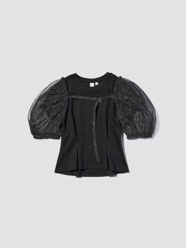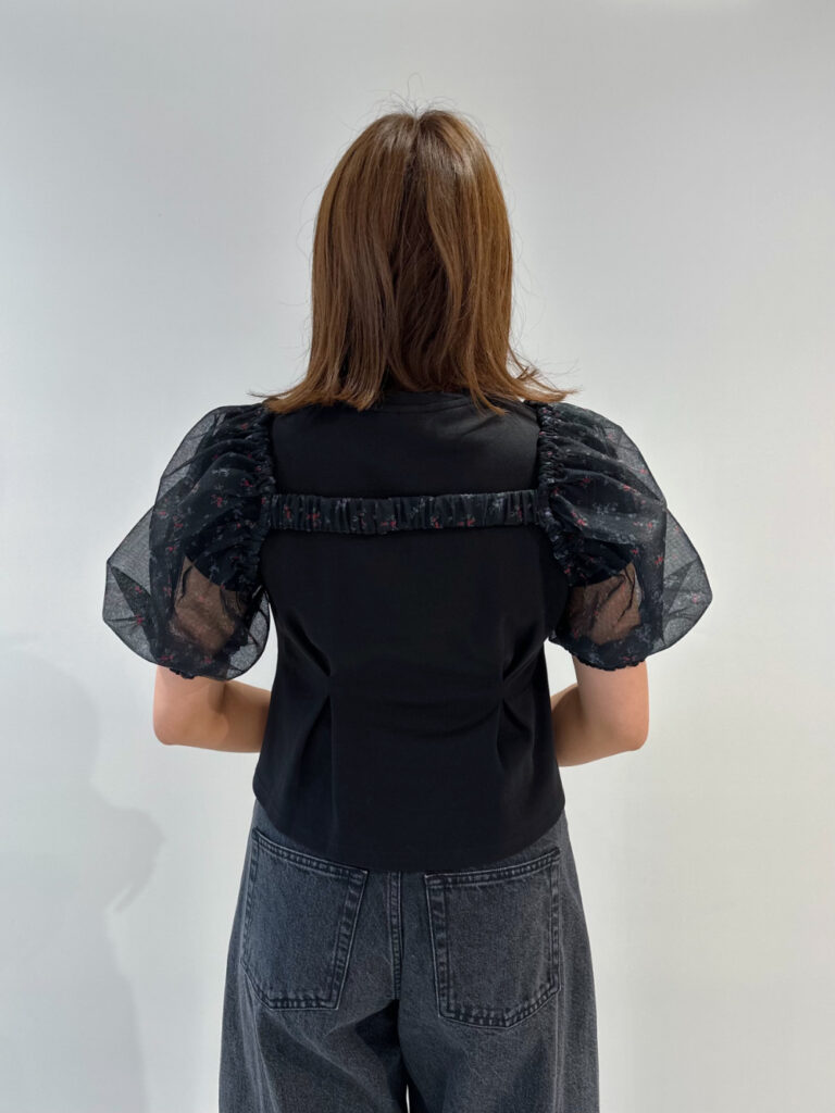 万能なオールブラックコーデを1ランク上げてくれるチュールボレロ。単調になりがちなブラックに、異素材感と抜け感を与えてくれます。さりげないフラワープリントをワンポイントに、ボックスタックを効かせたカットソーとバレルレッグジーンズで、単色でも奥行きのあるスタイリングが完成。