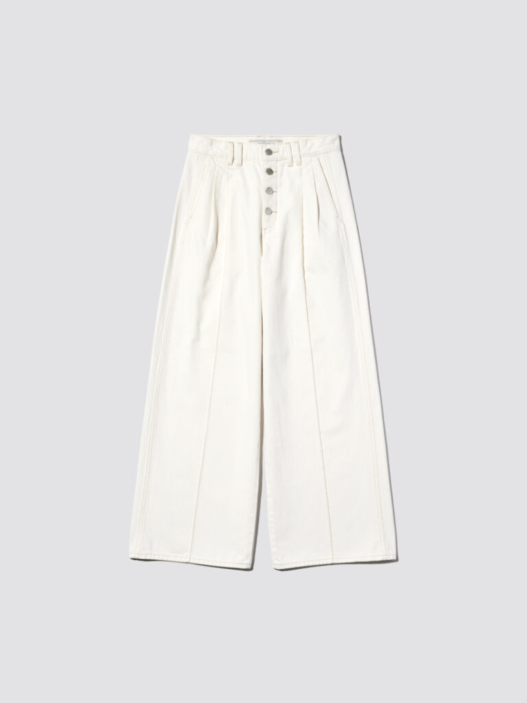 華やかで可愛らしいトップスも、パンツスタイルに落とし込めば大人なムードに。ブラウスの淡いブルーのストライプにマッチする、ホワイト×シルバーで春らしいカラーパレットを楽しんで。ハンサムなワイドジーンズの足元は、可愛げのあるメリージェーンでトップスとテンションを合わせます。