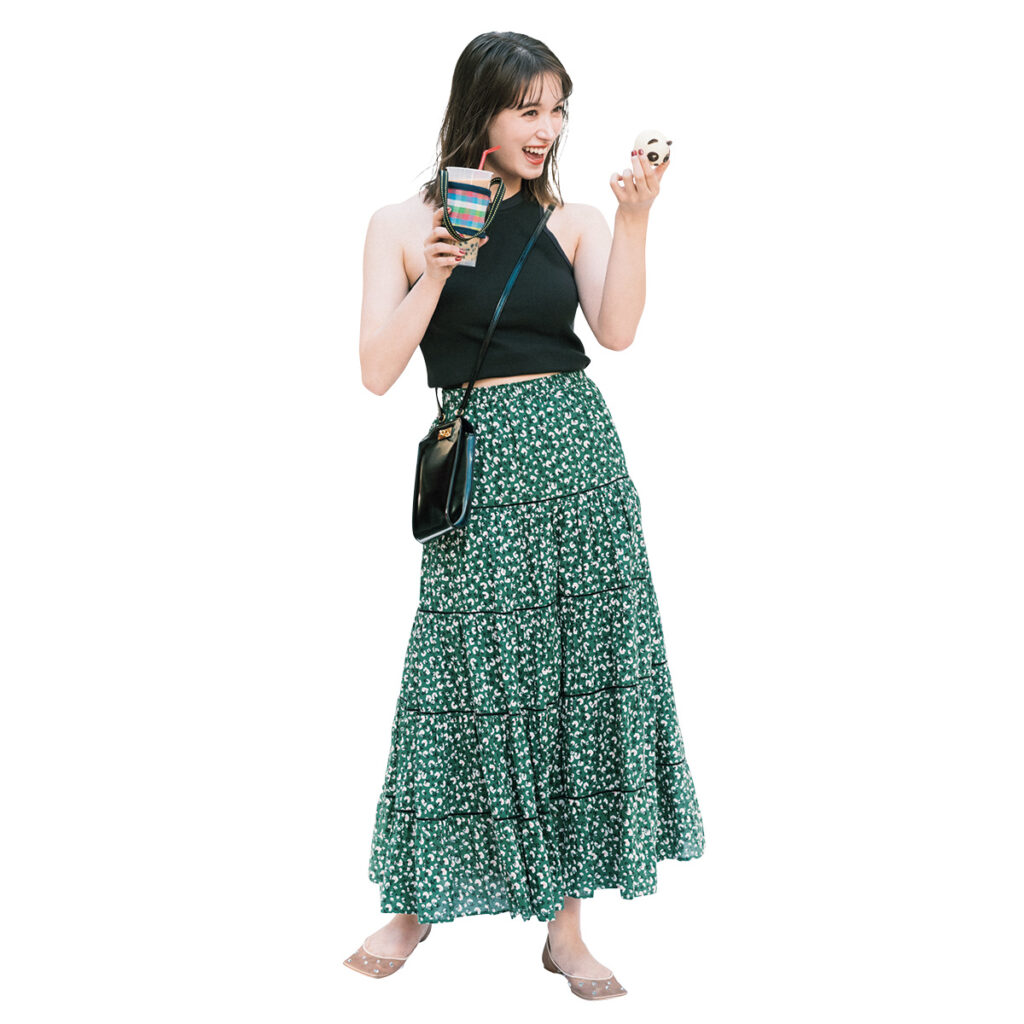 旅先で早速タンクトップデビュー!たくさん写真を撮る旅だから、スクエアトゥ×ストーン付きのフォトジェニックな足元で。フラットシューズ[H0.7㎝]¥39,600(ピッピシック)タンクトップ¥7,700(ケラウズランブラ/ジャック・オブ・オール・トレーズ プレスルーム)スカート¥35,200(ノーメント/ショールームセッション)バッグ¥23,100(ダイアナ/ダイアナ 銀座本店)