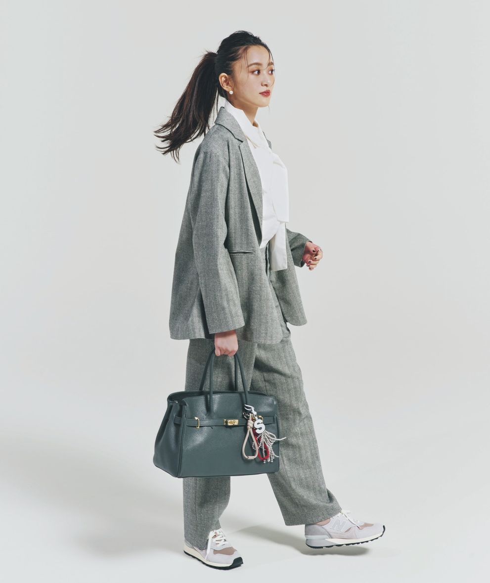 品の良さ漂うグレーのボストンバッグにチャームをつけて、大人の遊びゴコロを楽しむのも今季ならでは。グレーのジャケット×パンツのセットアップにボウタイブラウスを投入して、商談時にも映える華やかさをキープ。スニーカーでハズせばこなれ感のある通勤コーデが完成です。