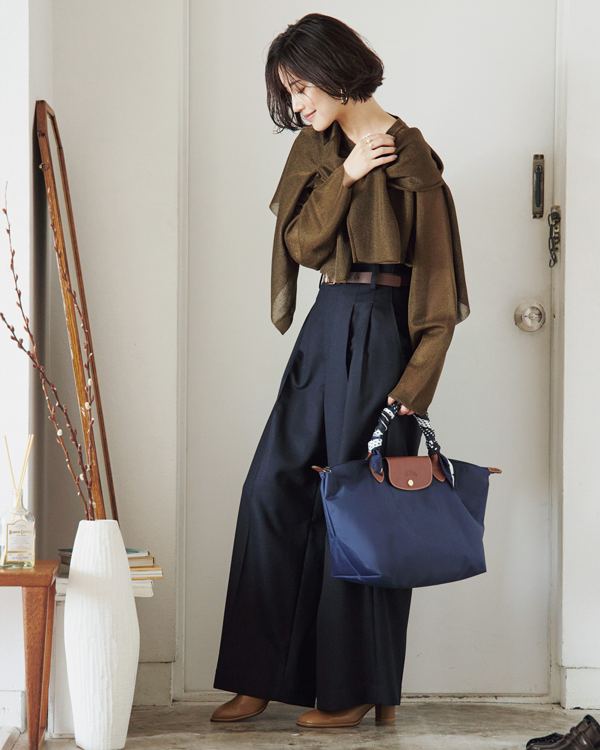 どんな服装にも合わせやすい黒は、通勤バッグの一軍選手。少し曲線がかったフォルムなら黒のシャープさが和らぎ、ハンサムなジレ×パンに女性らしさをプラス。肩掛けOK、マチしっかりめなので外勤デーでもばっちり。