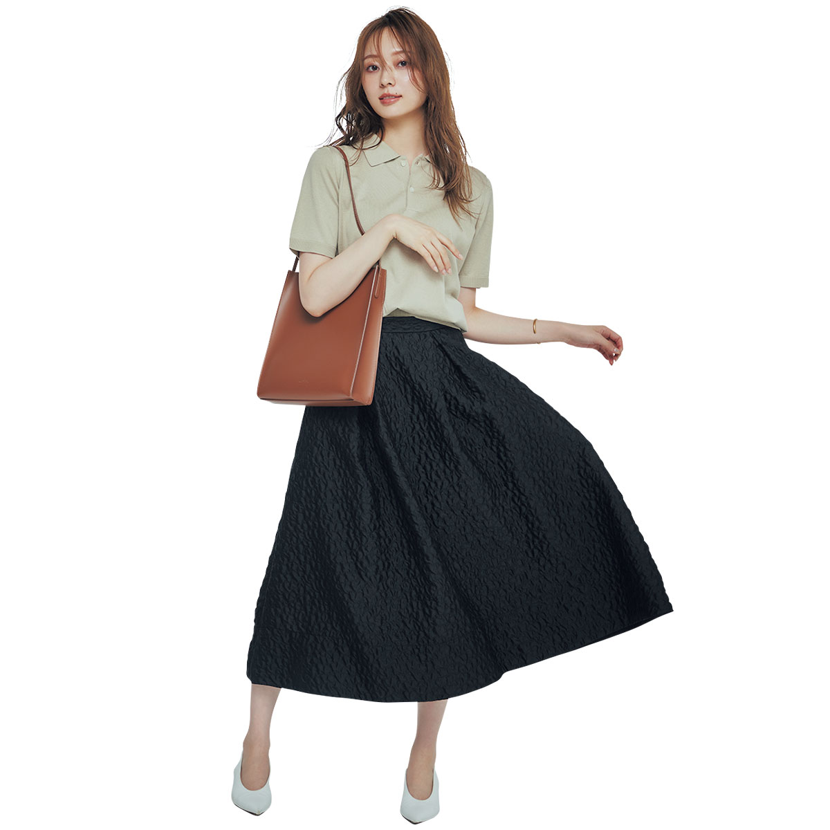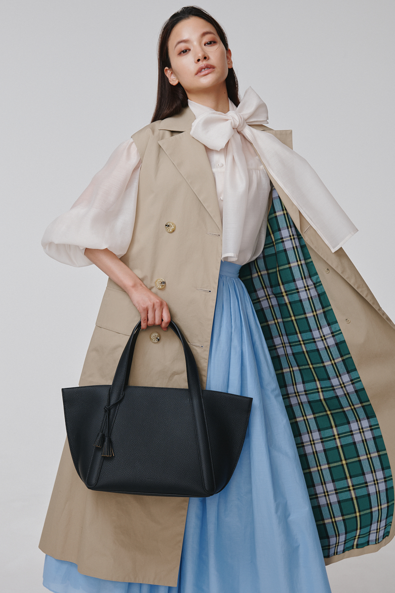 ボウタイにフレアスカート、トレンチジレ…オシャレアイテムを盛り込んだ春らしいスタイリングには、ミニマムさが際立つ黒のトートバッグがマッチ。主張しすぎないクリーンなデザインながらマチがしっかりあるので、書類やタブレットの収納に申し分なし。きれい色や柄アイテムをきりりと引き締めてくれる、ファッションアイテムとしても重宝します。