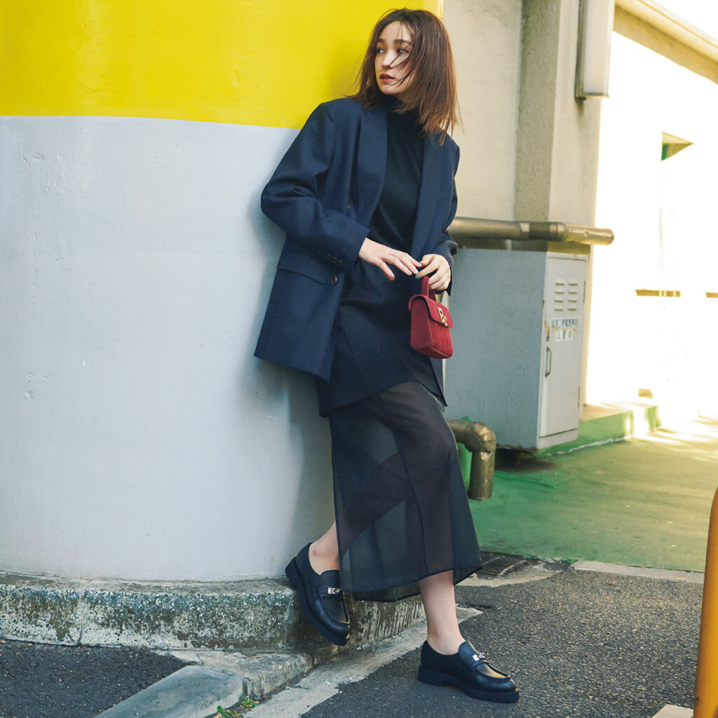 ミニスカートにシアーをレイヤードしたデザインで味変。ジャケット¥88,000(ザ シンゾーン/シンゾーン ルミネ有楽町店)ニット¥23,100(スローン/ザ ショップ スローン 新静岡セノバ店)スカート¥16,500(CODE Aワールド プレスインフォメーション)バッグ¥73,900(Cafuné カスタマーサポートセンター)靴¥35,200(銀座かねまつ6丁目本店)
