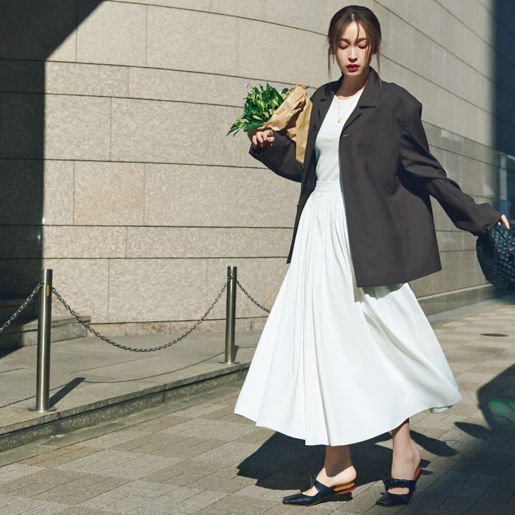私たちが持っていそうな白スカートも、Bigジャケットを合わせると新鮮。足元の抜け感もポイントでした。