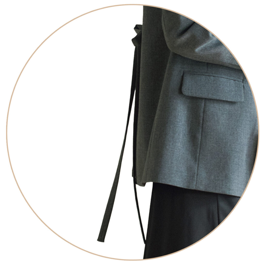 カットソーを2枚を重ねたようなデザインのトップスを仕込めば、楽して洒落見え。仕上げにグレーJKを羽織って、簡単グラデーションの完成。スカート¥3,990(UNIQLO)ジャケット¥38,500(シーニュ)トップス¥12,100(yori)イヤカフ¥89,100リング¥171,600(ともに Hirotaka/ヒロタカ 表参道ヒルズ)バッグ¥92,400(フルラ/フルラ ジャパン)パンプス¥33,000(ファビオ ルスコーニ/ファビオ ルスコーニ 伊勢丹新宿本店 本館2階 婦人靴)
