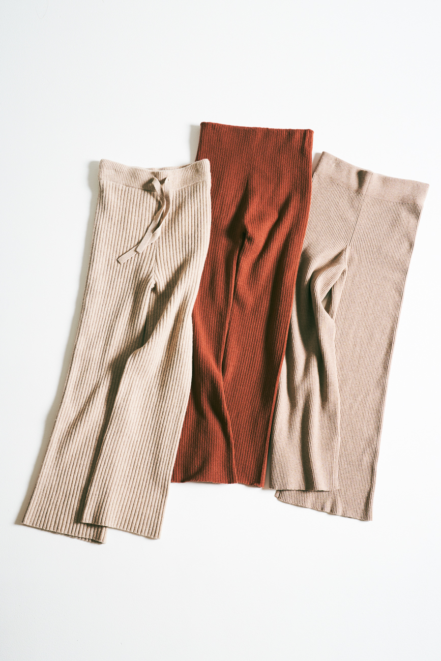 縦ラインを強調するリブと計算されたシルエットで、履いた人から“美脚”を実感。リブの太さや編地の違いで自分にぴったりのものが見つかるのも嬉しいポイント。どのパンツも同素材のニットトップスがあり、セットアップで購入する人も多いそう。サイズは2サイズ展開。【左】カシミヤ混ワイドリブセットアップパンツ¥9,200※10月中旬発売予定【中】ニットセットアップリブパンツ¥8,800※11月発売予定【右】裾スリットワイドニットセットアップパンツ¥8,800(すべてMila Owen ルミネ新宿2店)