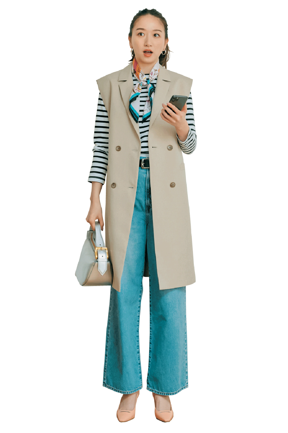 襟付きジャケットのハンサムさと、ノースリーブならではの軽やかさを兼ね備えたロングジレ。ボーダーとデニムの定番コーデに羽織るだけでスマートさが備わり、オフィスに馴染むきれいめコーデに更新されます。退勤後に予定があるときは、スカーフでモダンな華やぎを添えて、さりげなくドレスアップを。