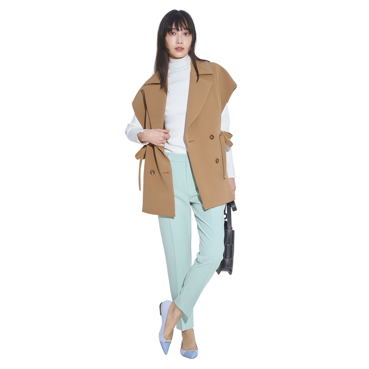 涼しげなミントカラーのパンツに白トップスを合わせた、軽やかなスタイリング。そのままだとぼんやり見えてしまうから、袖付きジレでメリハリをつけるのがポイントです。オフィスにマッチするきちんと感を添えると同時に、こなれた洒落感もゲット。