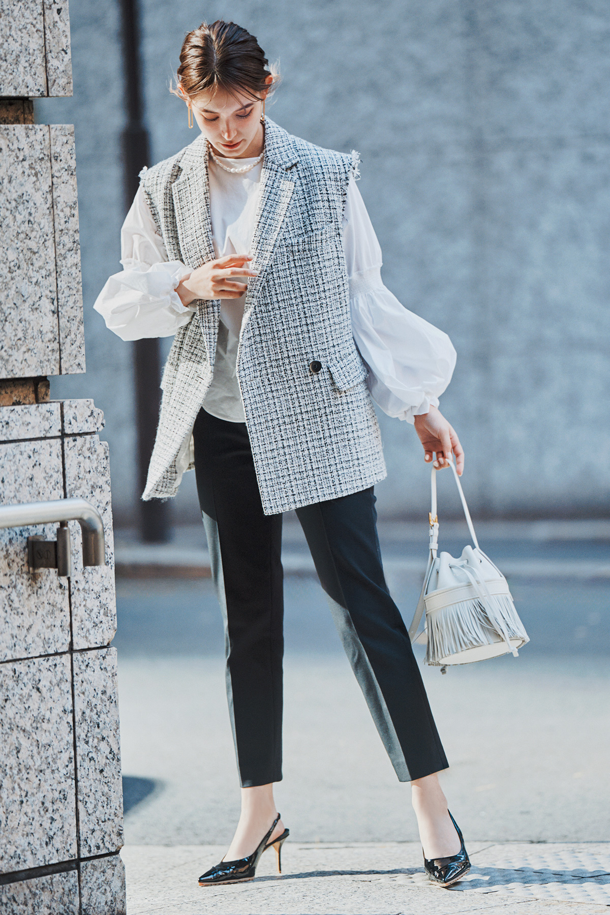 モノトーンのツイードMIXなら派手にならず、カラーレスな着こなしを無理なく垢抜けさせることに成功。ボリューム袖ブラウスが華やかなので下半身はシャープなスティックパンツで引き締めるのがコツ。年代性別問わず全方位から好印象を得られそうな、ほの甘通勤コーデに。