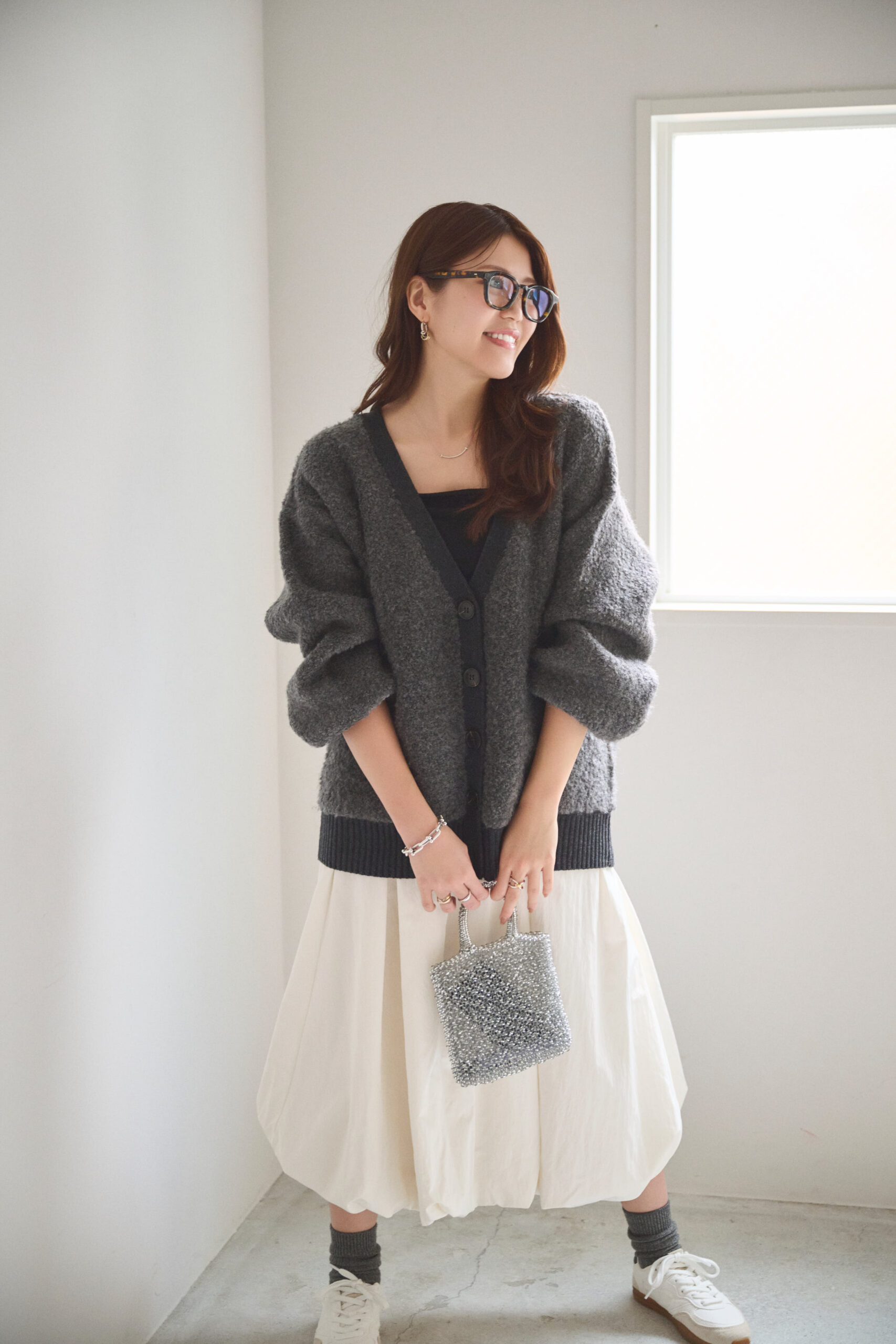「甘めなボリュームスカートは、モノトーンにするとちょうどいいバランスに。カーディガン1枚で過ごせる季節になったからこそ、ネックレスがアクセントになります。アンテプリマのバッグなど遊んだ小物を合わせて」