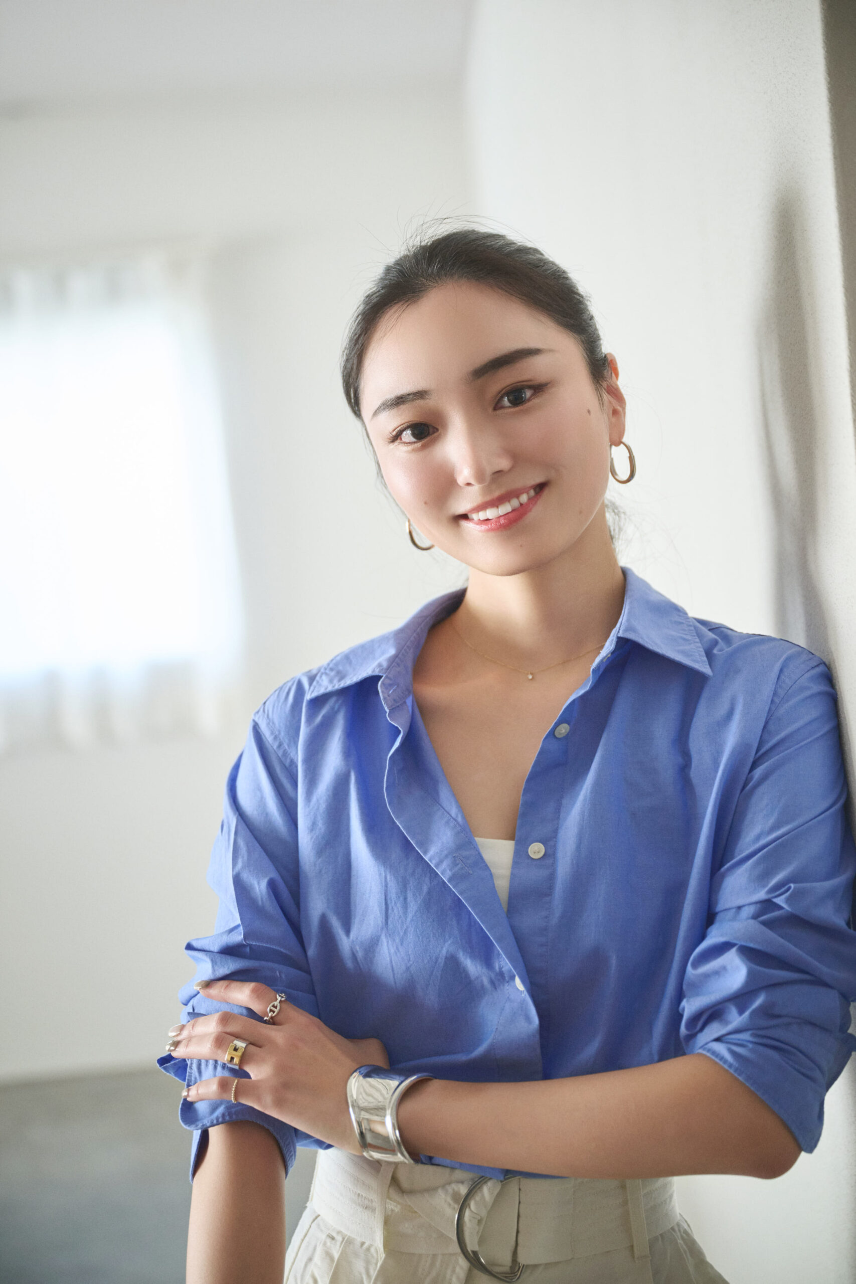 「ユニクロの清涼感のあるブルーシャツは、春にぴったりだと思って購入しました。形がキレイで高見えするのがお気に入りのポイント。メンズっぽいシャツの時は、シルバージュエリーで統一してハンサムにまとめます」