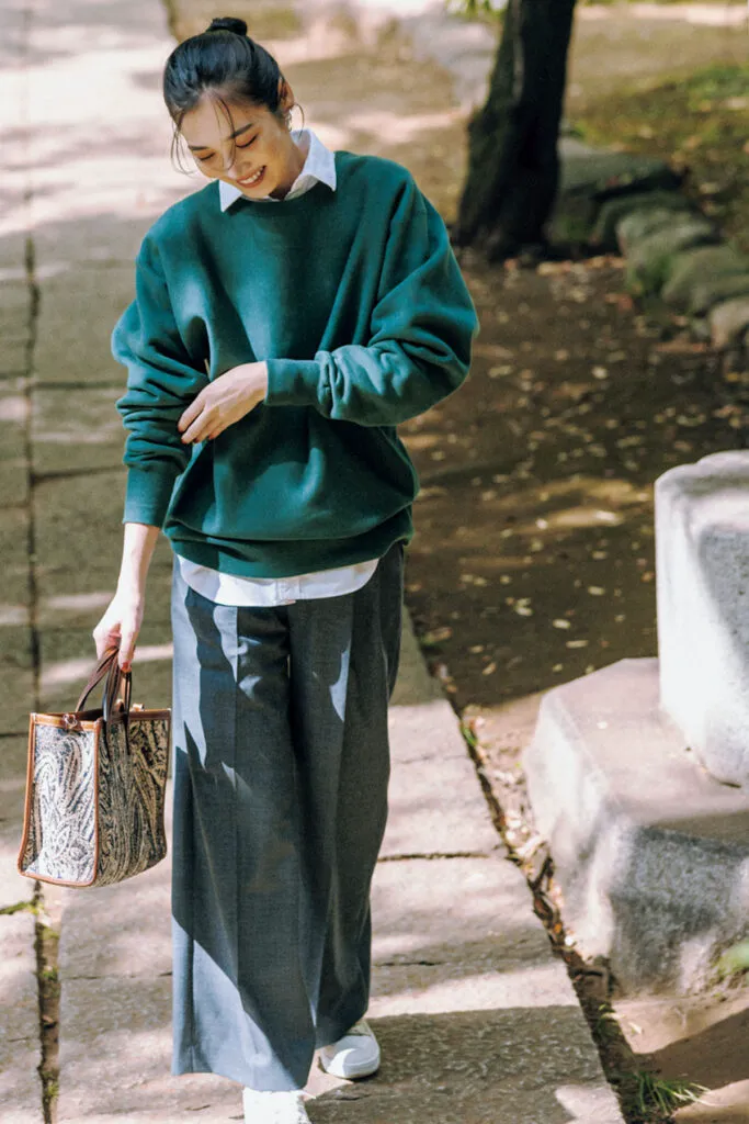 グリーンのスウェットトップスは、深まる秋にぴったりなカラー。インナーにシャツを着て、グレーのセンタープレスワイドパンツを合わせれば上品なきれいめカジュアルな休日コーデに昇格します。日差しが暑いときは肩がけしても、コーデの差し色として優秀。
