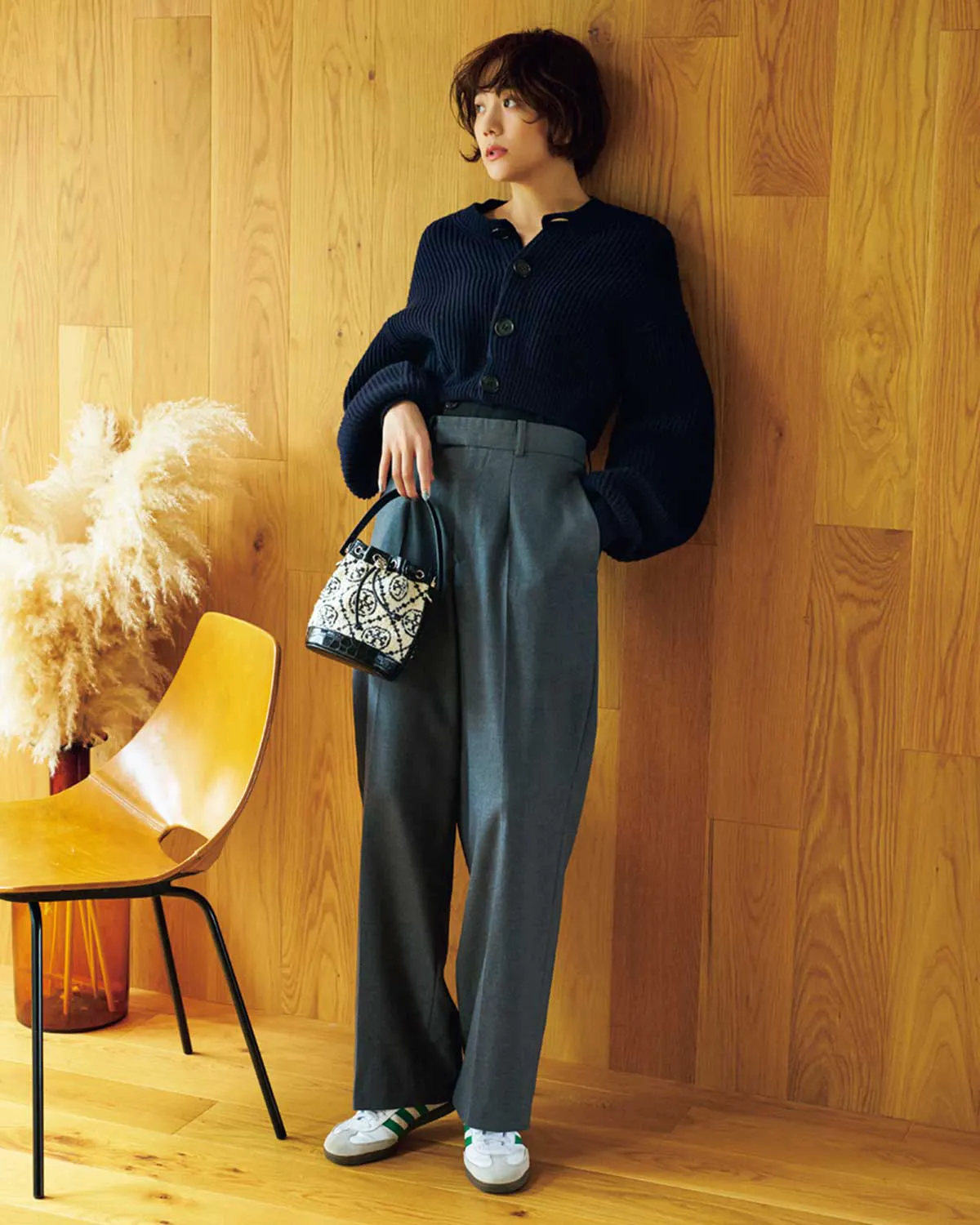 年始挨拶に親戚宅を訪問するなら、好感度重視のきれいめカジュアルが失敗知らず。ネイビーのカーディガンをニットのように1枚で着て、グレーのワイドパンツできちんと感を。足元は玄関先で脱ぎ履きしやすいスニーカーをチョイス。小物はあえて白地のものを選ぶことでコーデに軽やかさをプラスしてくれます。