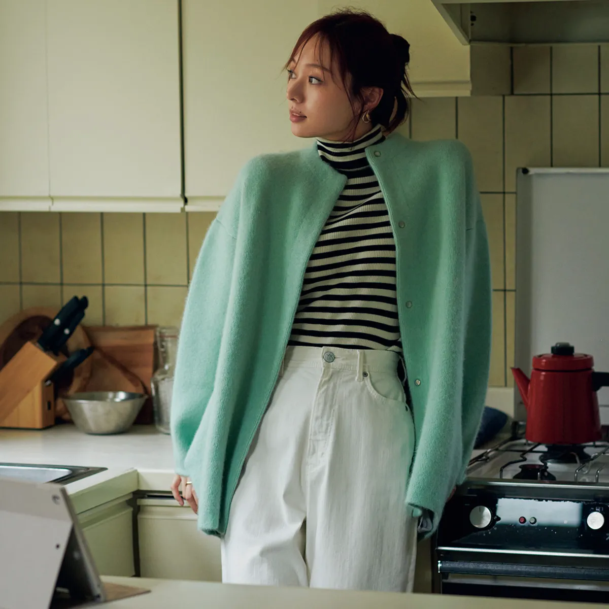 リラクシーでいながらおしゃれも楽しみたいホームパーティには、ゆるっとしたホワイトデニムがぴったり。きれい色カーデを羽織ってモノトーンコーデを格上げしつつ、ボーダーニットで引き締めるとグッドバランスに。