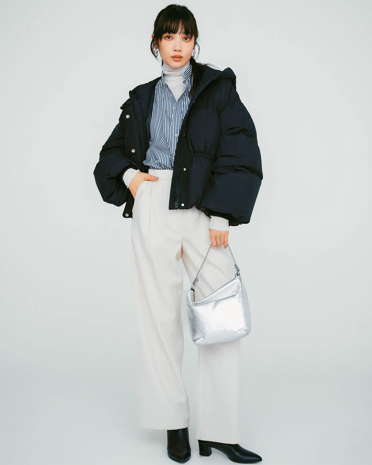 寒い日の通勤は冷え対策を重視したいところ。ダウンを着てオフィスに行くなら、ショート丈が動きやすく脱いだときもスマート。さらに、ワイドパンツとの相性抜群で、簡単にスタイルアップが叶います。全身が重くならないようパンツは白を選んで爽やかに。