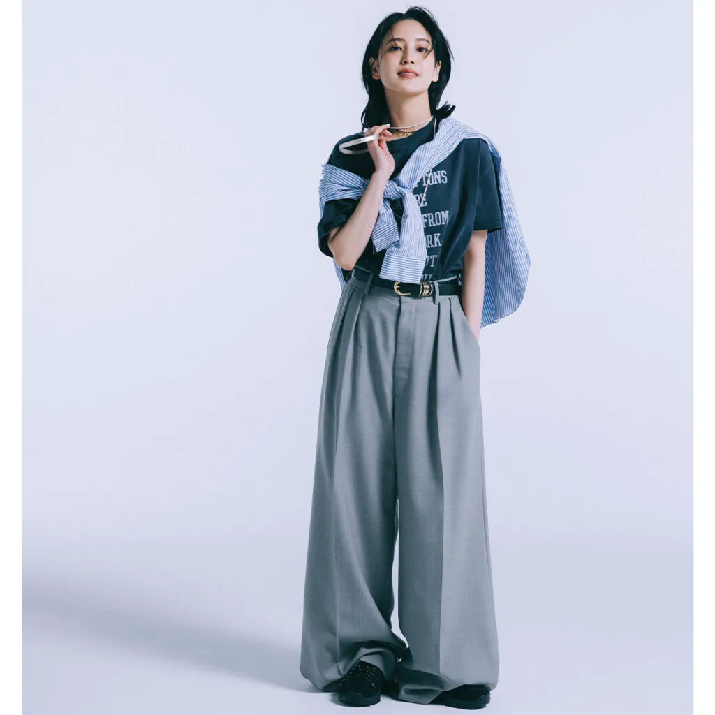 ワイドパンツは、足元の選び方で仕上がりの印象が大きく変化。きれいめに仕上げたい日は、ヒール付きパンプスやブーツ、ローファーで上品に。カジュアルに寄せたいときは、スニーカーやサンダル、フラットシューズでこなれたムードに。気分や予定に合わせてバランスを楽しんで。