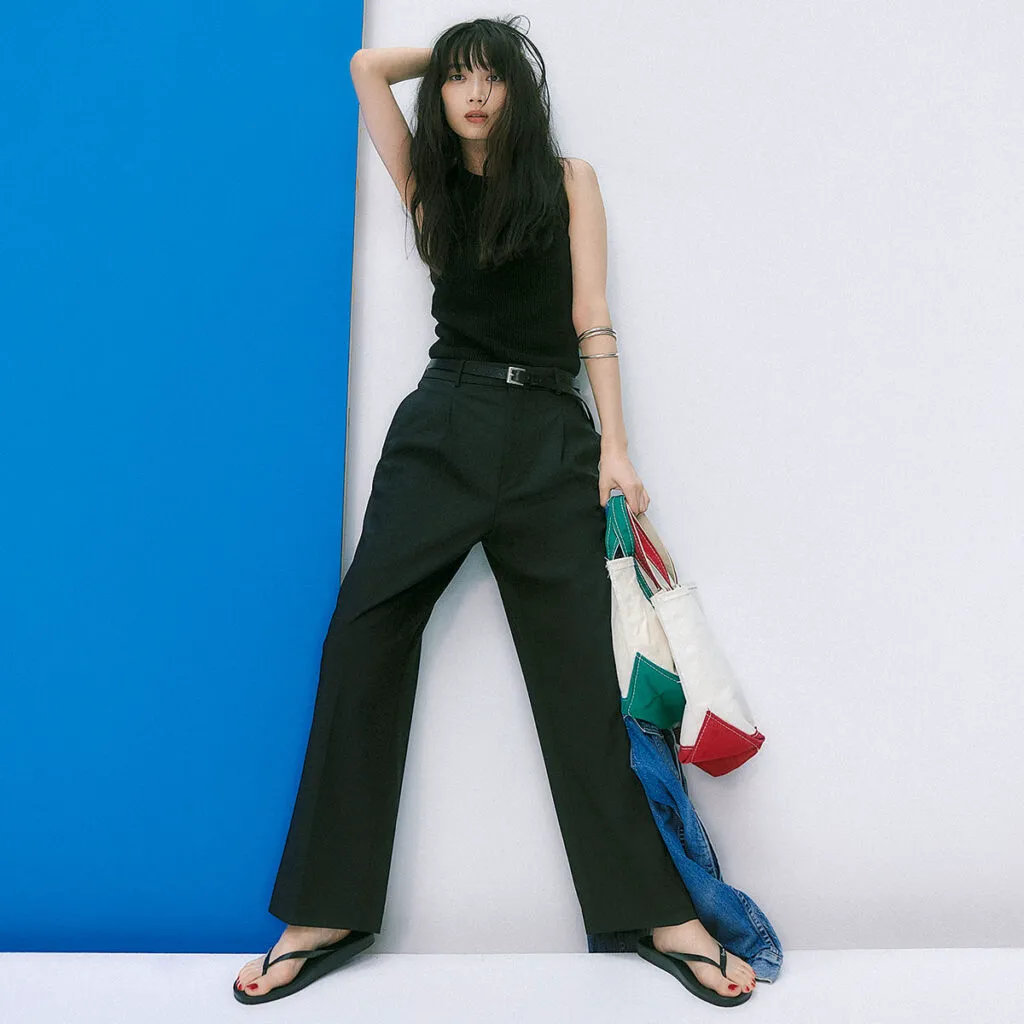 ゆるっとすごしたい夏の日帰り旅行には、ワンサイズ上のタックワイドパンツを選んでみて。ウエストを落として穿くワザで新鮮なシルエットにチェンジできます。タンクに加え、ベルトとビーサンも黒で統一。デニムシャツとカラフルなバッグで夏らしく。