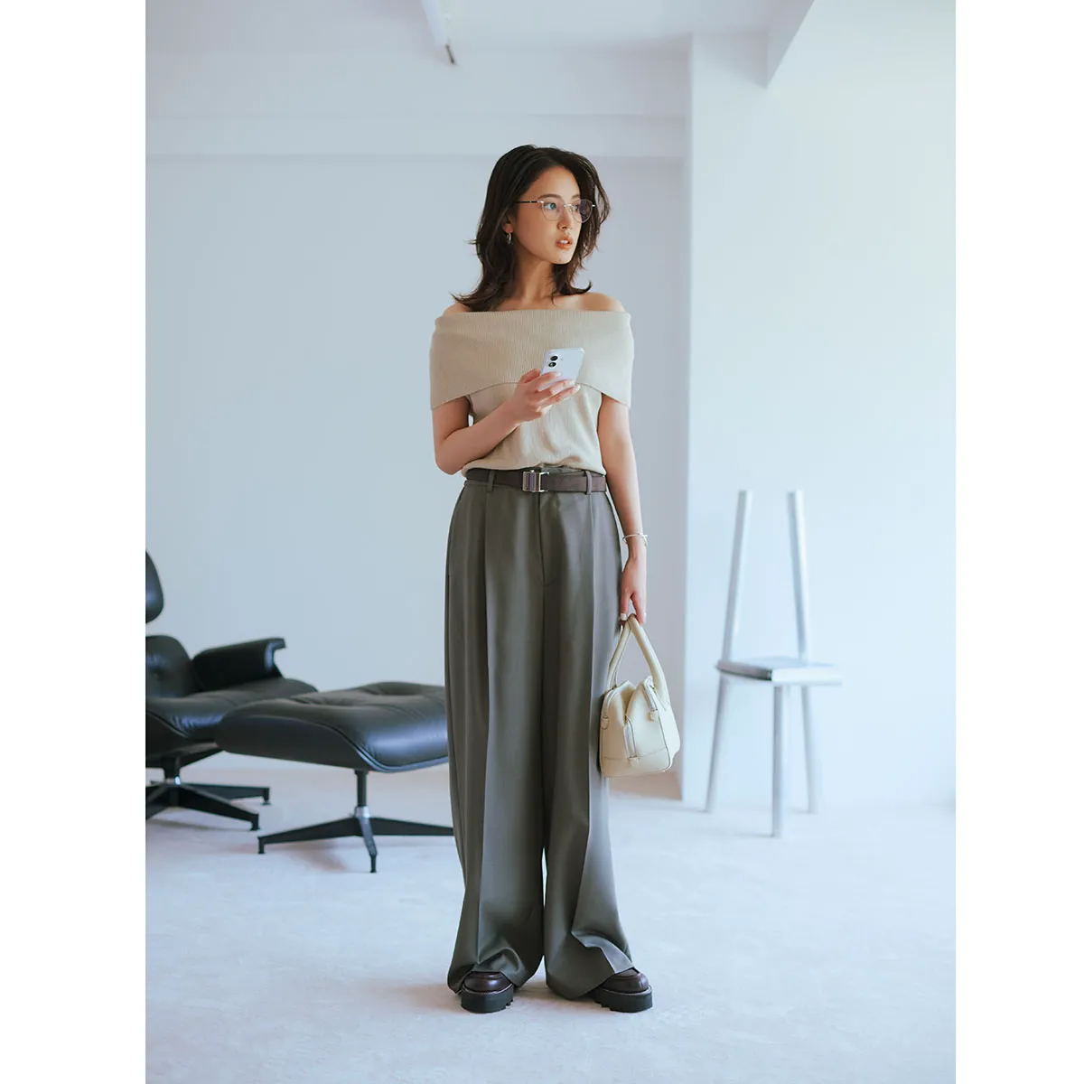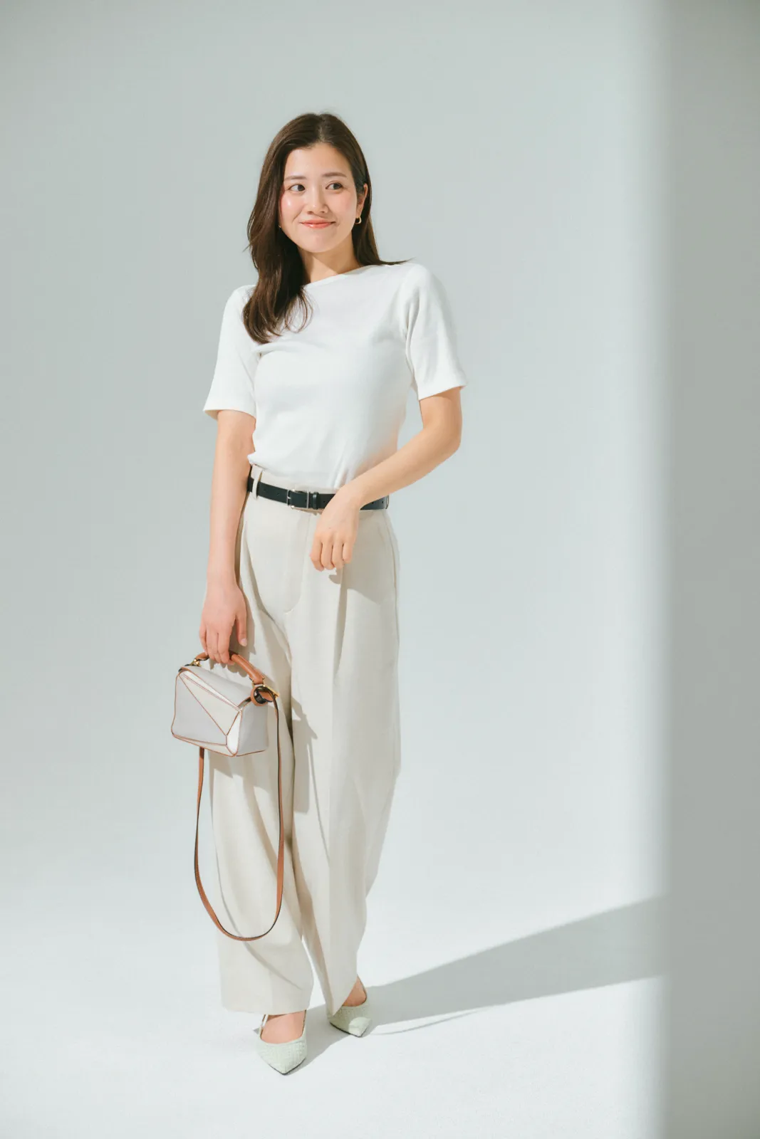 膨張見えが気になる上下ホワイトは、黒ベルトのウエストマークでスマートに攻略。きちんと感のあるワイドストレートとセンタープレスの効果で、すらりと脚長に。引き締め効果のある小物使いが、スタイルアップに一役買ってくれます。