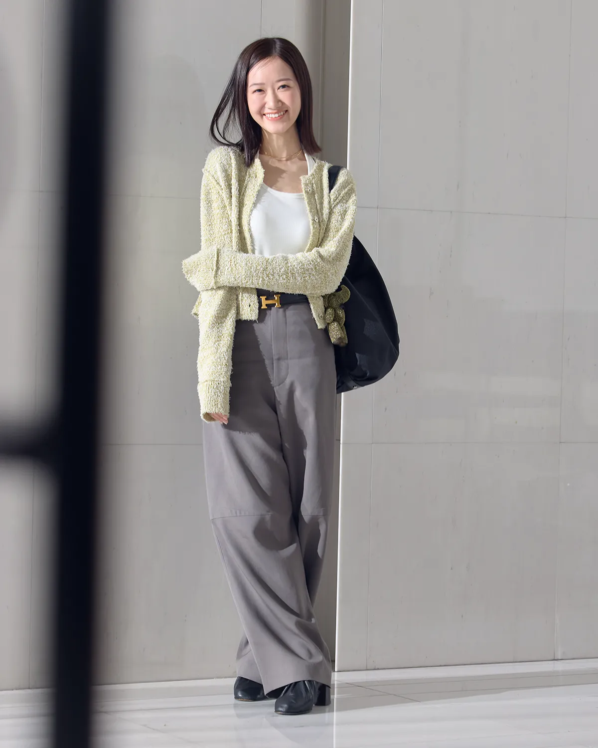 きれい色カーデとグレーのワイドパンツでヘルシーさを意識。「カーディガンをユニクロの白インナーに重ねて、ボトムスはカーブシルエットと重くないグレーが絶妙なH BEAUTY & YOUTHのパンツを合わせました」(樟 杏莉さん)