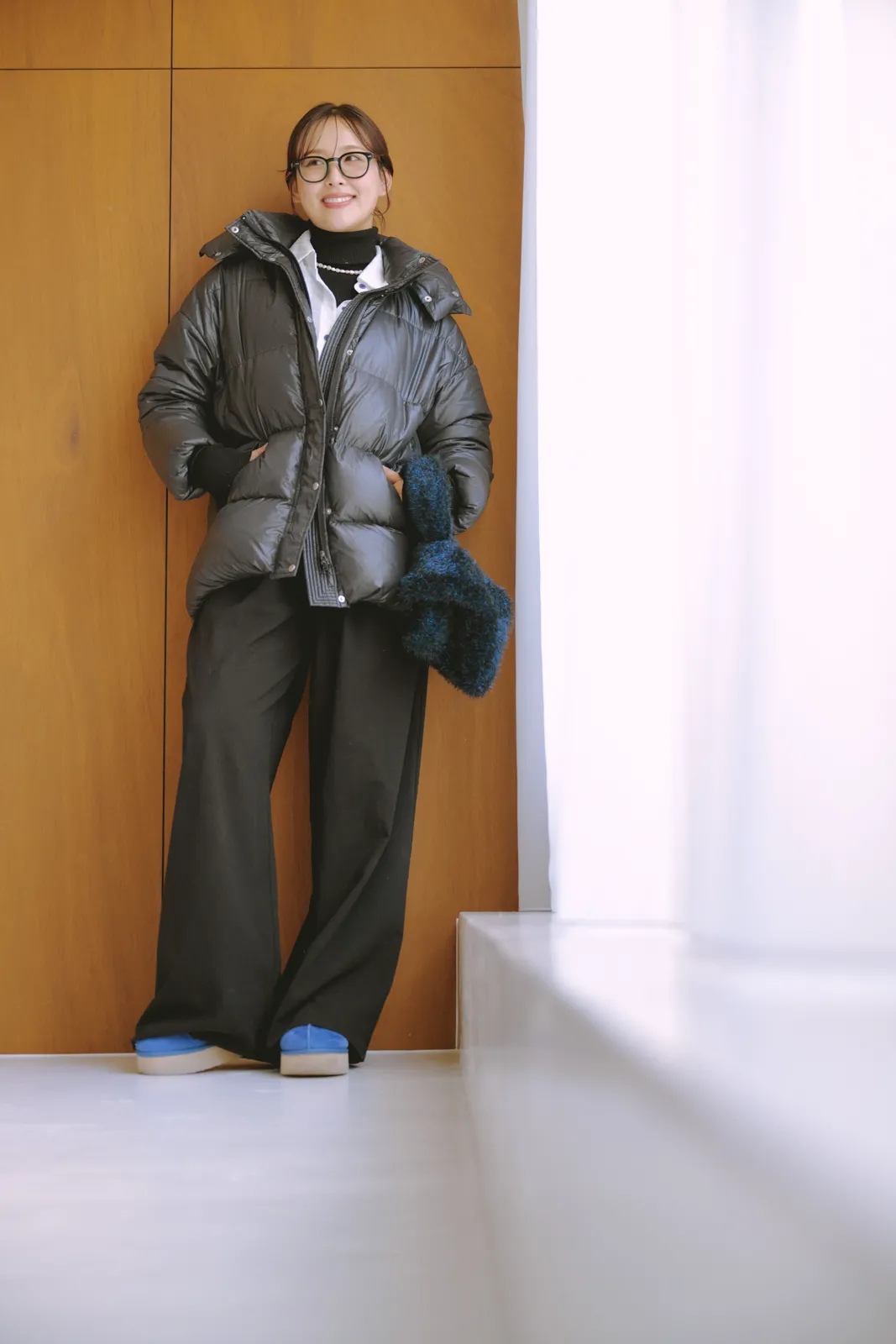 流行中のブラウンパンツに鮮やかなブルーカーデで新鮮さを