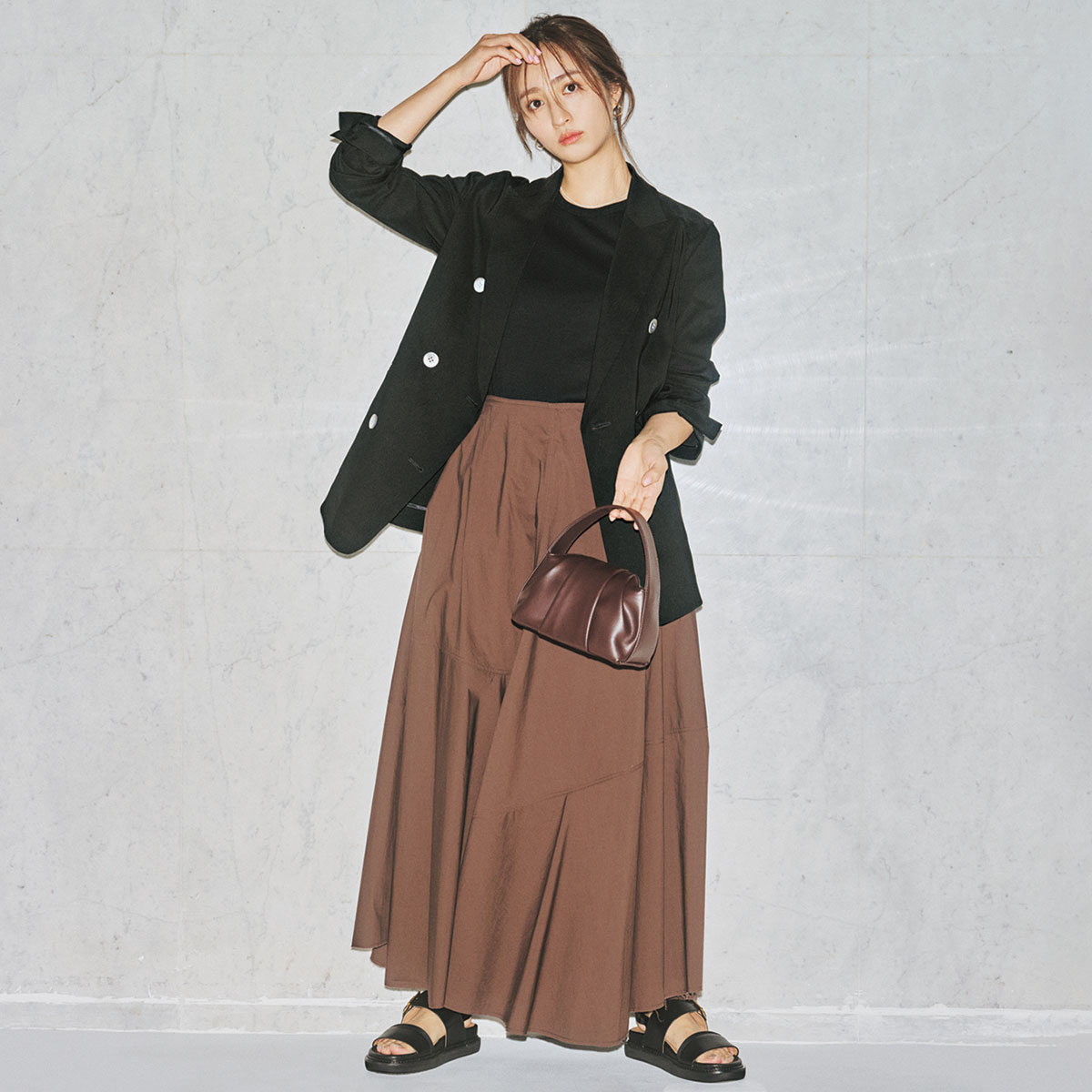 相棒の黒ジャケットを合わせても重たくならず、春らしい軽快な装いに。スカート¥42,900(イレーヴ)Tシャツ¥9,900(スリードッツ/スリードッツ表参道店)ジャケット¥42,900(23区/オンワード樫山 お客様相談室)バッグ¥29,000(ルメン)サンダル¥24,970(J&M デヴィッドソン/モーダ・クレア)ピアス¥97,900(マリハ)