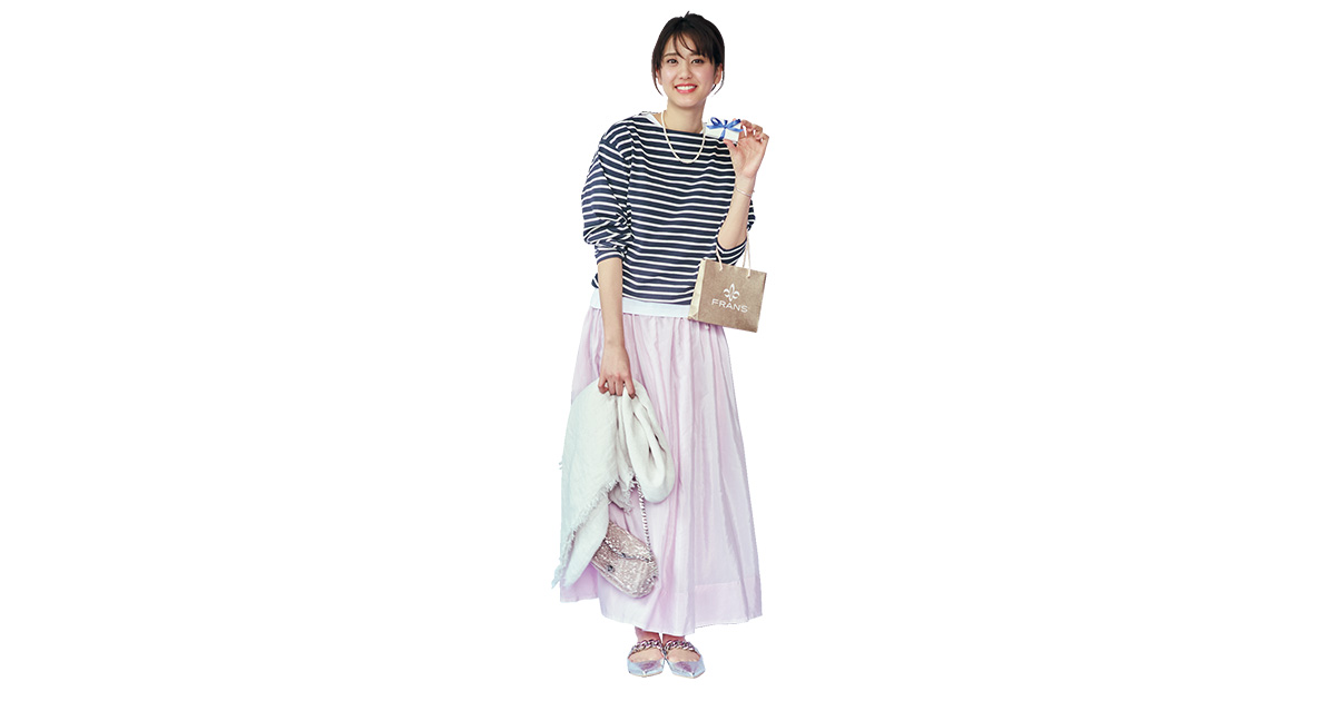 「京都BAL」でショコラ好きの友達に「フランズチョコレート」を。箱の色やリボンが選べたりするところも好き。ソルトキャラメルが有名だけど、トリュフも美味しい!バッグ¥79,200(アンテプリマ/ワイヤーバッグ/アンテプリマジャパン)シューズ¥47,300(プリティ・バレリーナ/F.E.N.)ネックレス¥22,000〈ジゼルベー〉バングル¥30,360〈バルブス〉(ともにZUTTOHOLIC)ストール¥29,700(アソース メレ/アルアバイル)