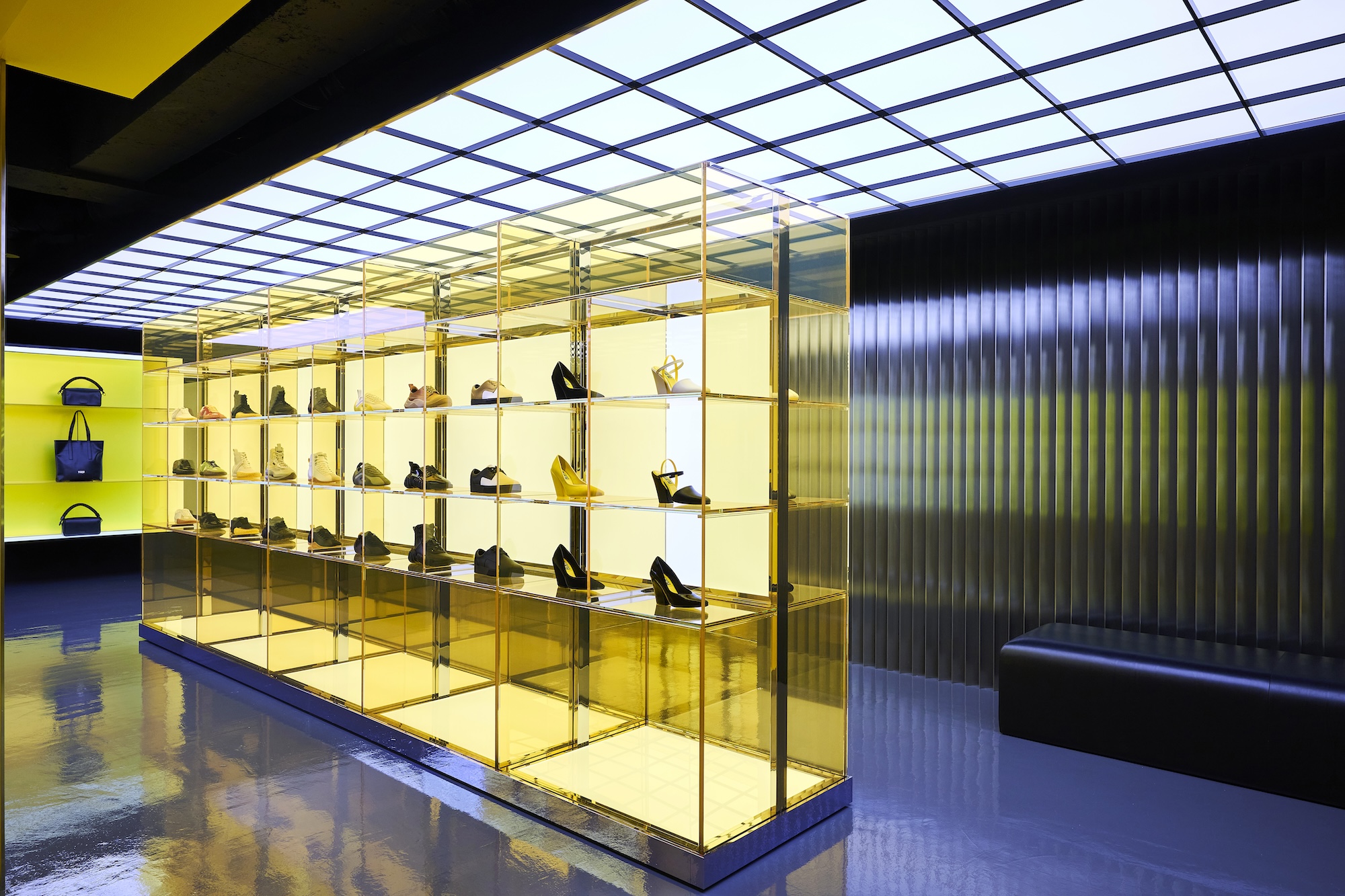 注目は、高度な職人技により精緻に手作業で組み立てられた巨大なイエローのガラスエレメント。圧倒的な存在感を放ち、格子模様の天井やライティングと相まって、空間に奥行きと洗練さをもたらし、近未来的なタッチを添えています。