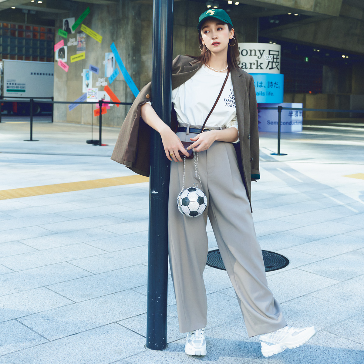 白×黒×グレーのクールな配色に、グリーンキャップでカジュアル感をプラス。ワイドパンツの端正さをほどよく崩すことで、ストリートときれいめが交差する旬のバランスに。カラーレンズの黒ぶち眼鏡で、知的な印象も。