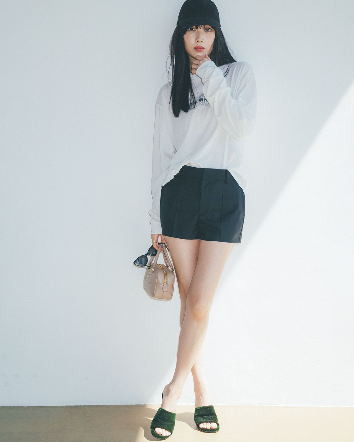 肌見せ分量の多いショートパンツも、キャップを合わせればヘルシーな印象に。体が泳ぐロンTでゆったりとしたムードを纏う組み合わせも、いやらしく見えないポイントです。ヒールやレザーバッグを合わせて上品なリラックス感を備えた新鮮な装いに。
