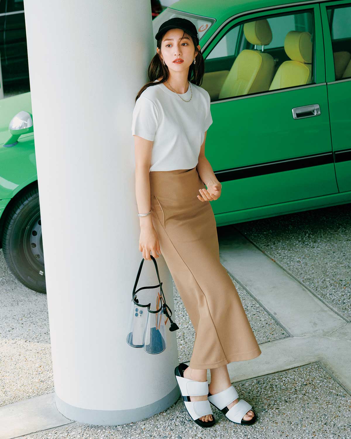 Tシャツ×マーメイドスカートのシンプルコーデに「何か足りない…」と思ったら、黒キャップが有効。色を絞ったワントーンがキリリと引き締まり、スカートの女っぽさを引き立てます。シンプルだけど地味に見せない、大人のこなれスタイルが完成。