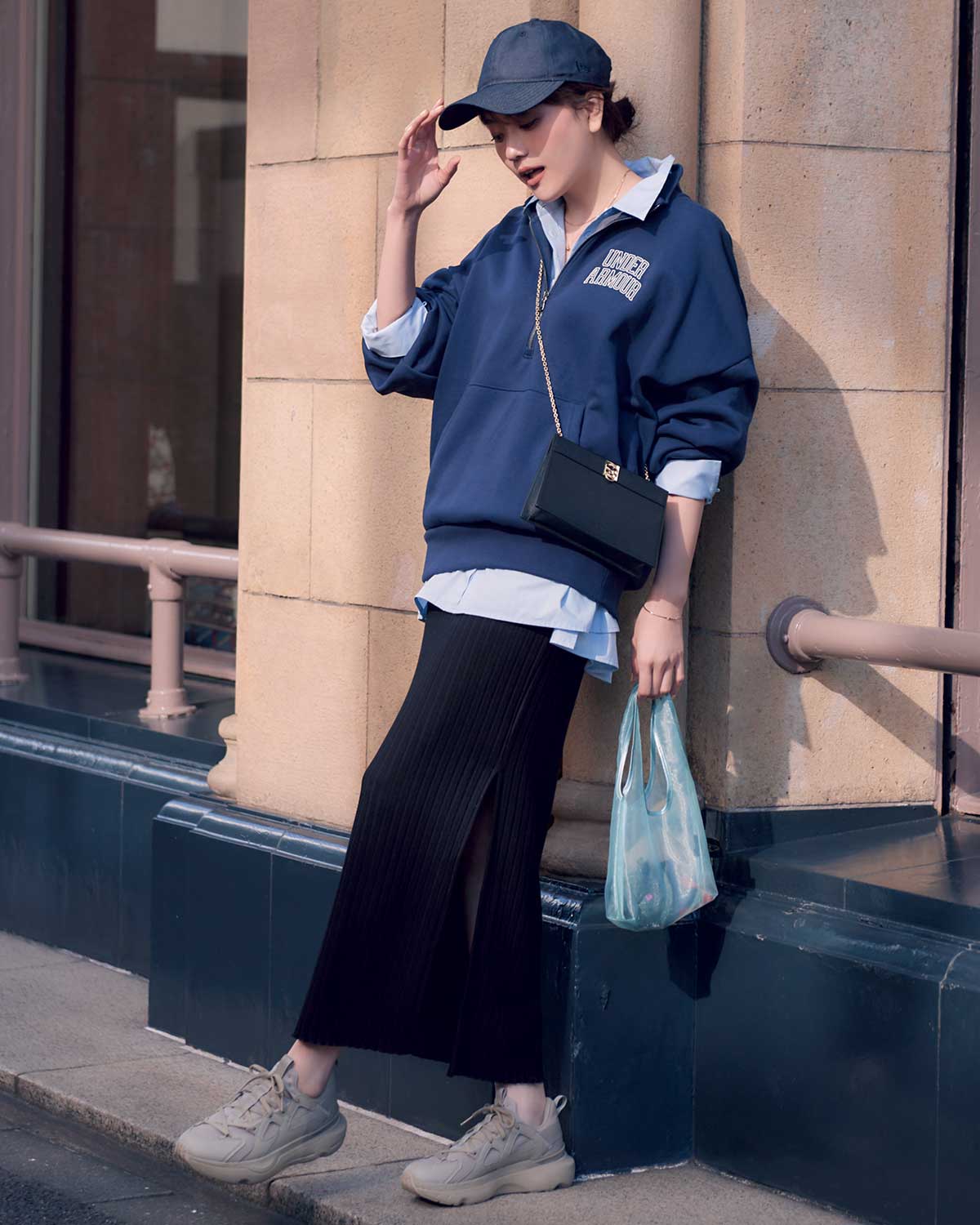 レディな印象の黒タイトスカートも、スポーティなハーフジップ&キャップでほどよく着崩せば、肩の力が抜けたコーデに。きちんと感を添えるシャツのレイヤードで、カジュアルすぎず都会的な装いに。チェーンバッグを足せばほんのり華やいでお出かけにぴったり。