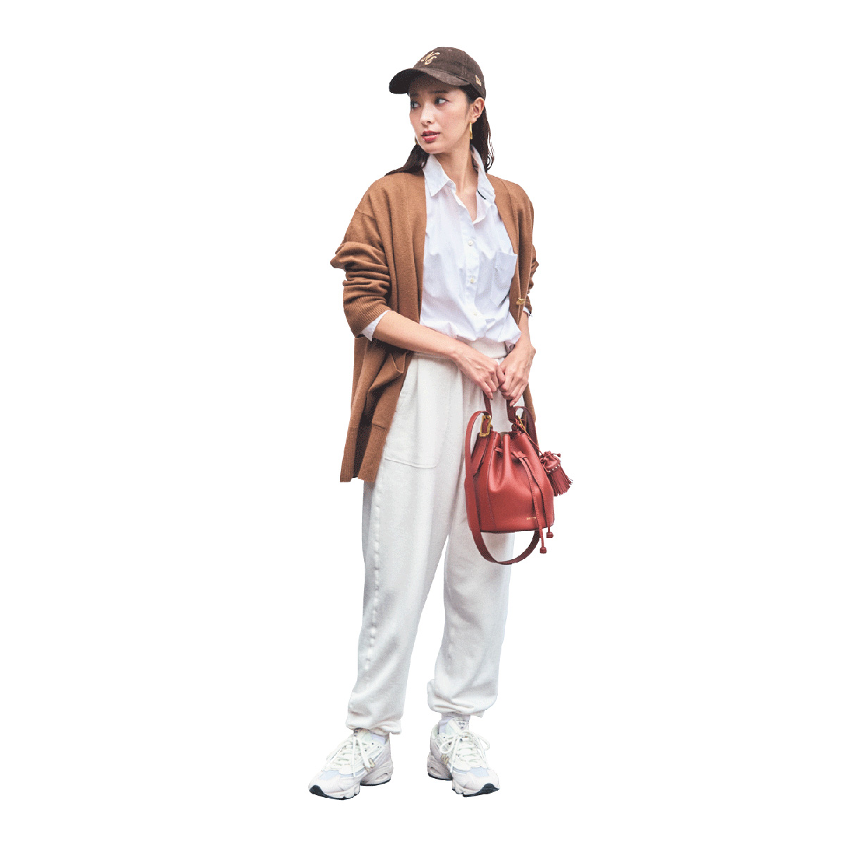 上下白のクリーンな着こなしに、ブラウンのカーディガンとキャップで優しげなニュアンスをプラス。きれいめな白シャツがラフすぎない印象を保ってくれるから、スウェットパンツも大人顔に決まります。赤バッグの差し色で女っぽさもほんのり添えて。