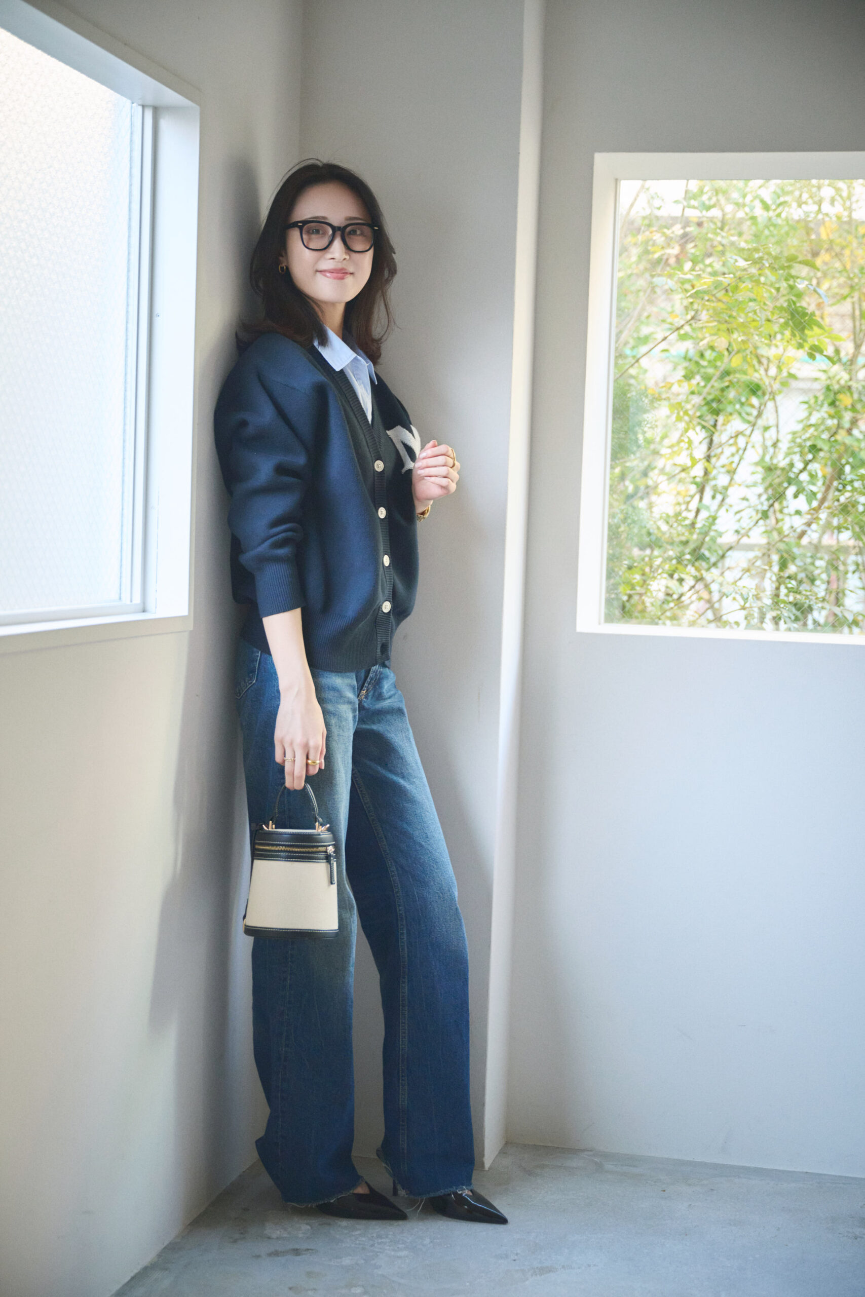 「プレッピーなスタイルがこの春の気分。ネイビー×デニムの組み合わせに、ブルーシャツを重ねることで今っぽく更新してみました。黒縁メガネはフレンチ感も出せるから、コーデが締まるのでお気に入り」