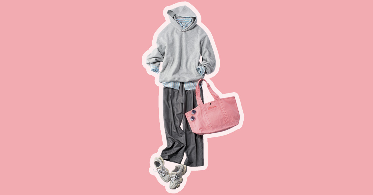 『CLASSY.』着回しDiaryから、おすすめコーデをピックアップ!フーディとウエストゴム仕様のパンツの楽ちんコーデも、グレーのワントーンでまとめれば上品カジュアルの完成!ストライプのシャツをレイヤードしてオシャレ心も忘れずに♡差し色ピンクトートのおかげで、ぐっと春らしさがプラスされます!