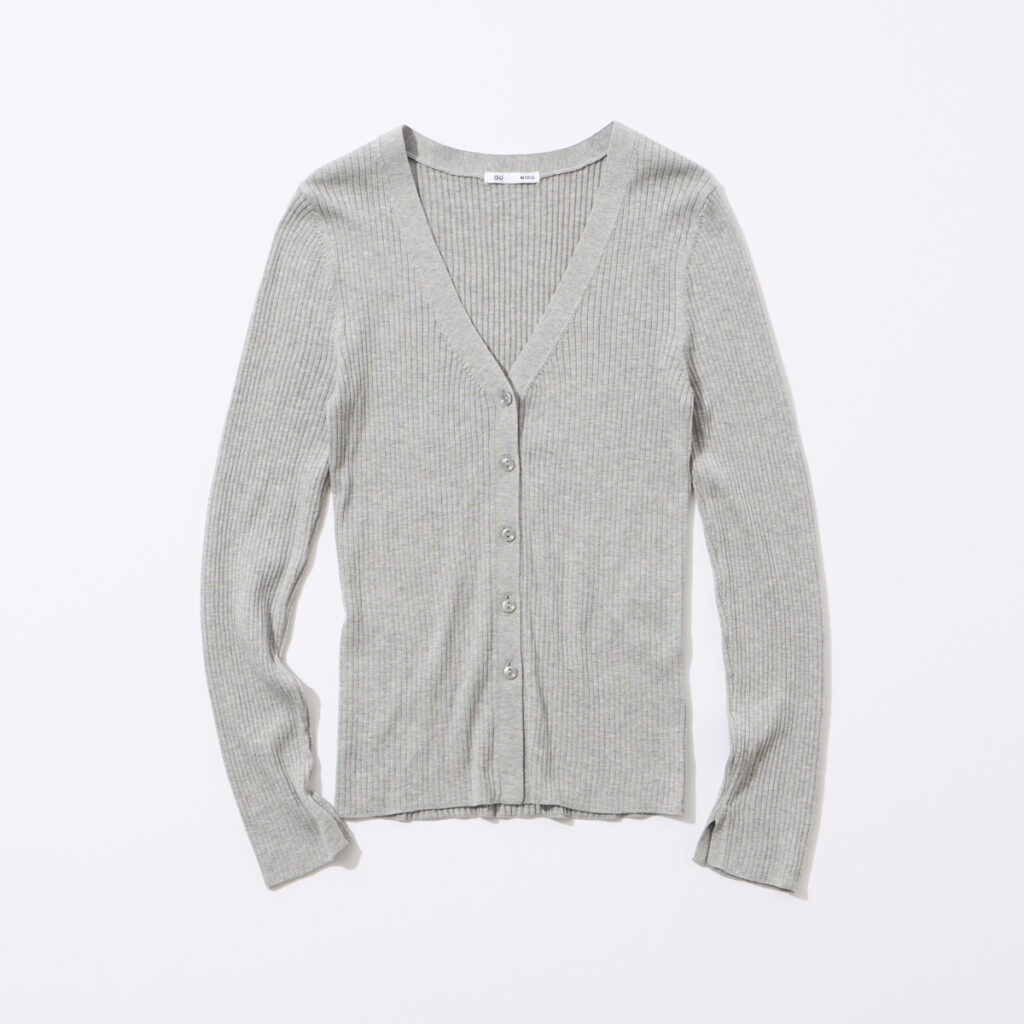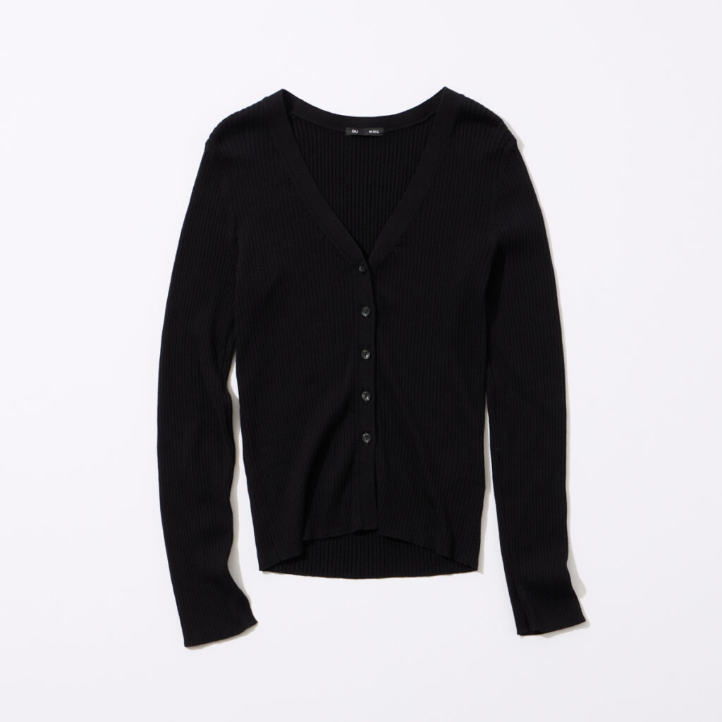 羽織りとしても1枚着としても活躍。身体のラインをすっきりと見せるナローシルエットなので、スタイルアップにも最適です。フレアシルエットのボトムスと合わせるのがおすすめ。カーディガン各¥1,990(GU)