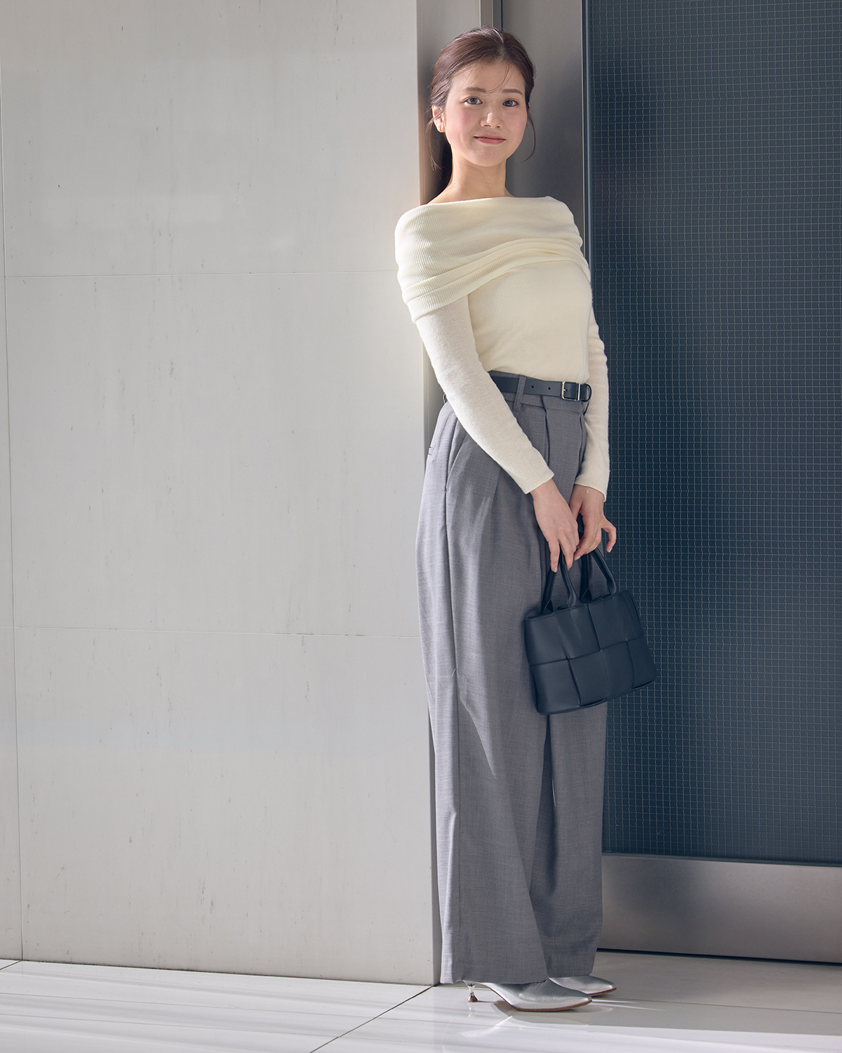「白のオフショルダーとシルバーのパンプスを合わせて春らしいコーデにしてみました。パンツスタイルでもメンズライクになりすぎないよう、甘辛ミックスなコーデが好きです」