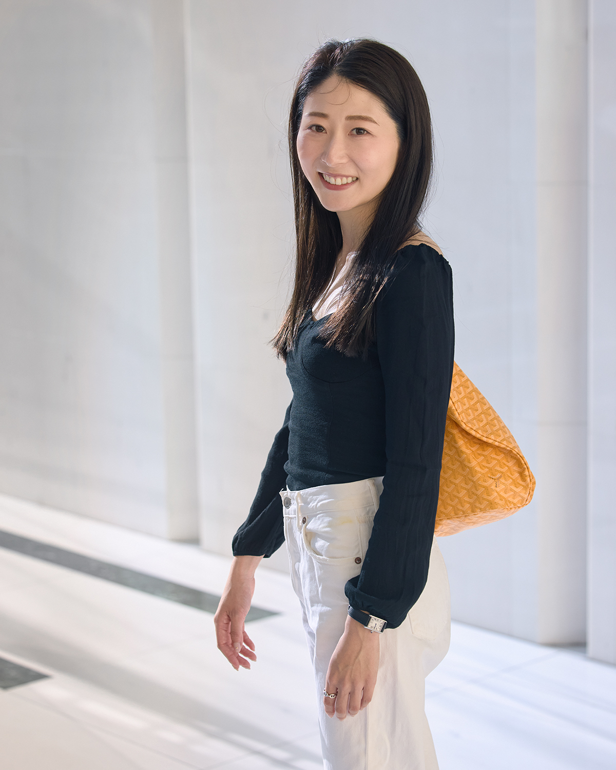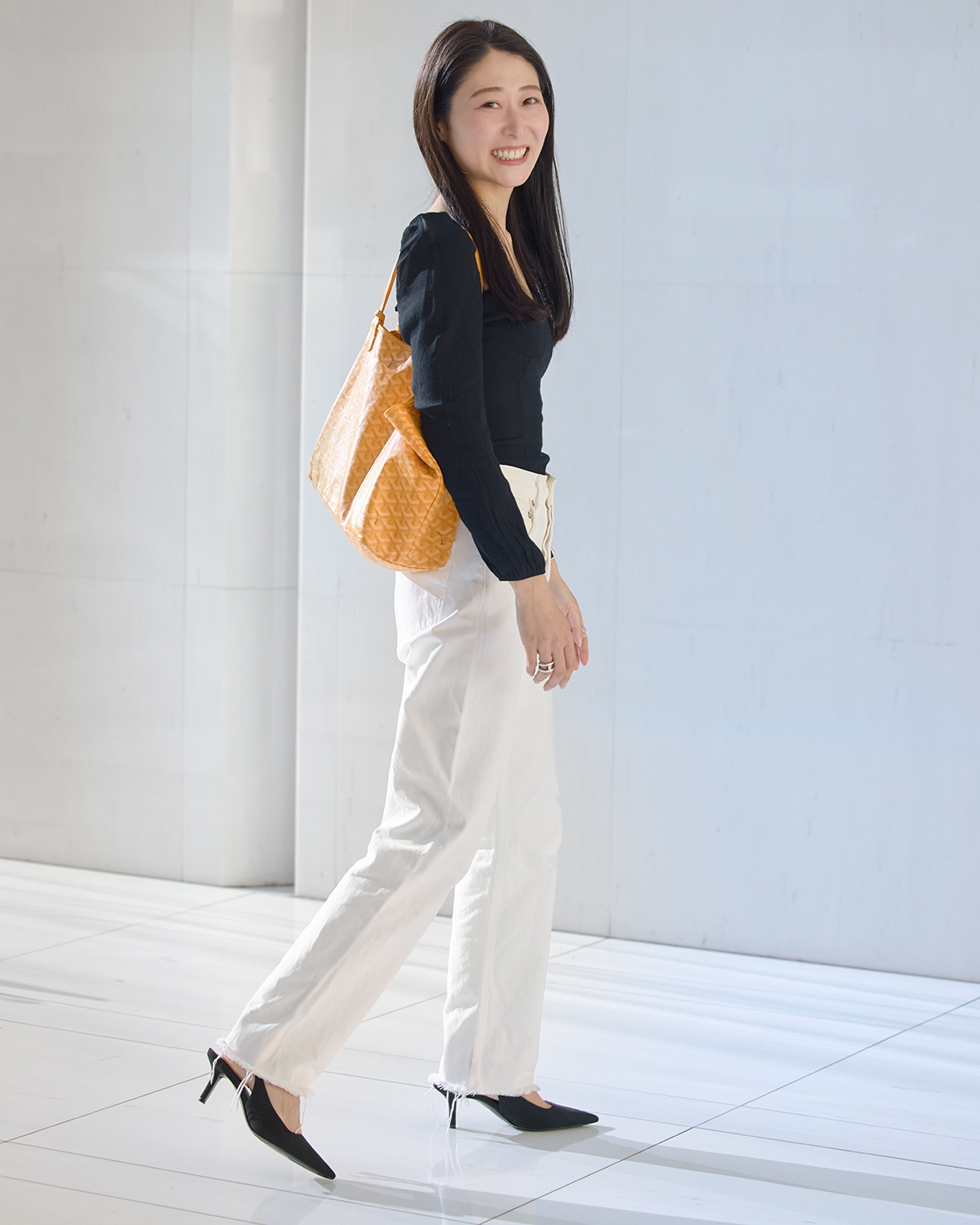 「定番のホワイトデニムにフェミニン要素のあるトップスを合わせるコーデに最近ハマっているので、肩周りと胸元にデザインのあるリフォメーションのトップスを合わせました。カジュアルですが、自分の気分が少し上がる服です」