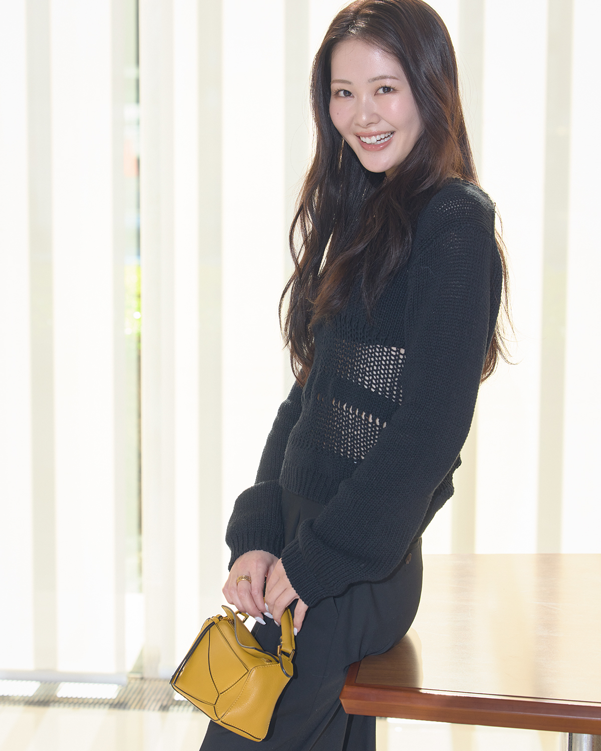 「ブラックのワントーンコーデですが抜け感も出したく、透かし柄がポイントのニットトップスを着ています。ワントーンコーデに色を一つだけ入れるコーデにハマっています」