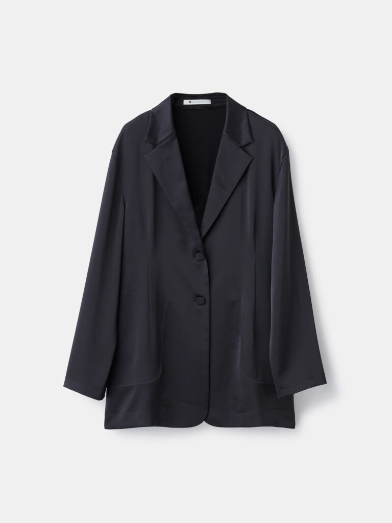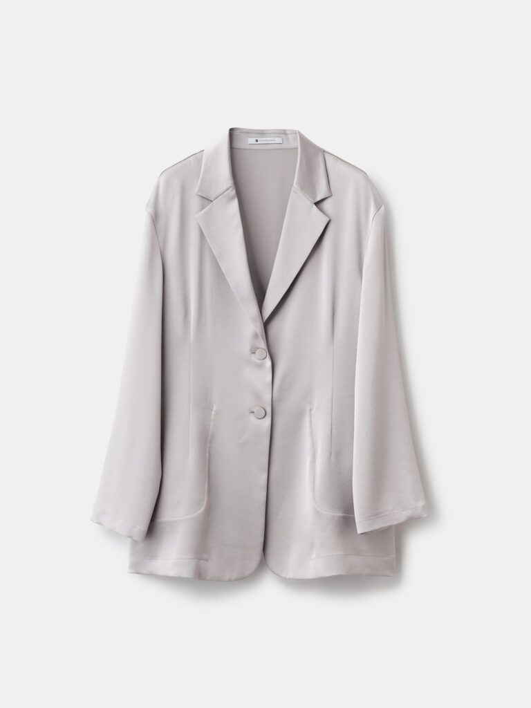 「トリアセサテンジャケット」はヒップラインが隠れる着丈のオーバーサイズのシングルジャケットです。脇の縫い目に沿ってついたポケットのステッチがデザインポイント。リラクシーなシルエットをくるみボタンで上品な印象に仕上げています。