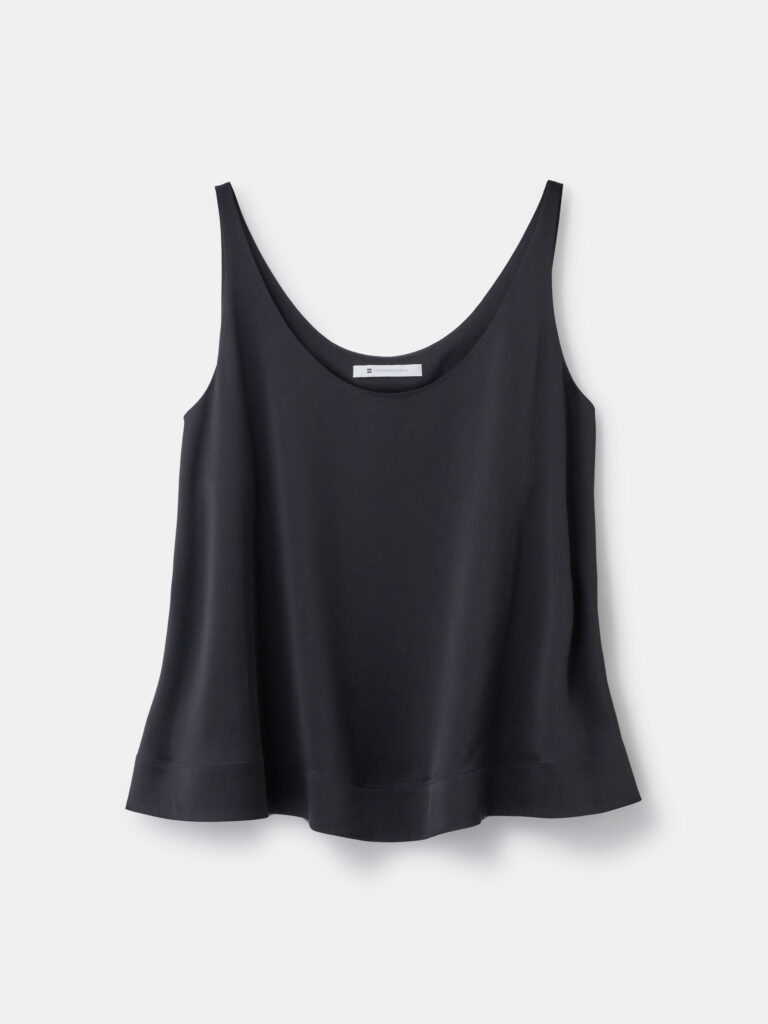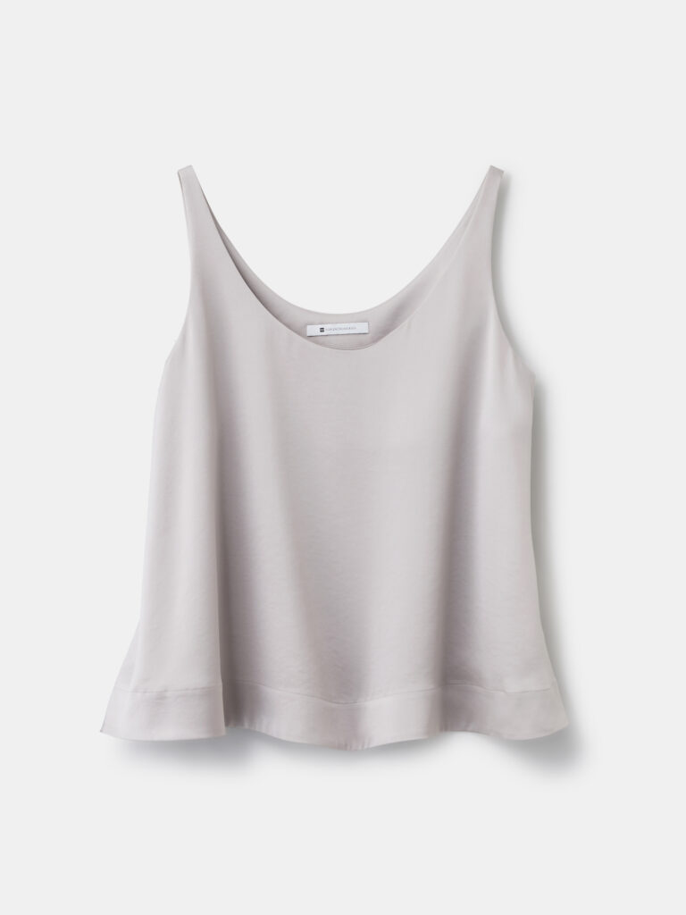 ディテールをそぎ落としたシンプルなデザインの「トリアセサテンノースリーブブラウス」は、肩ひもを可能な限り細く仕上げ、華奢で繊細な印象に。デコルテ周りや袖周りは、素材の高級感を損なわないようステッチレスにし、裾に向かってドレープが生まれるような仕立てにしています。