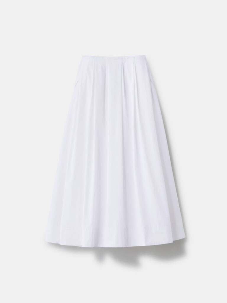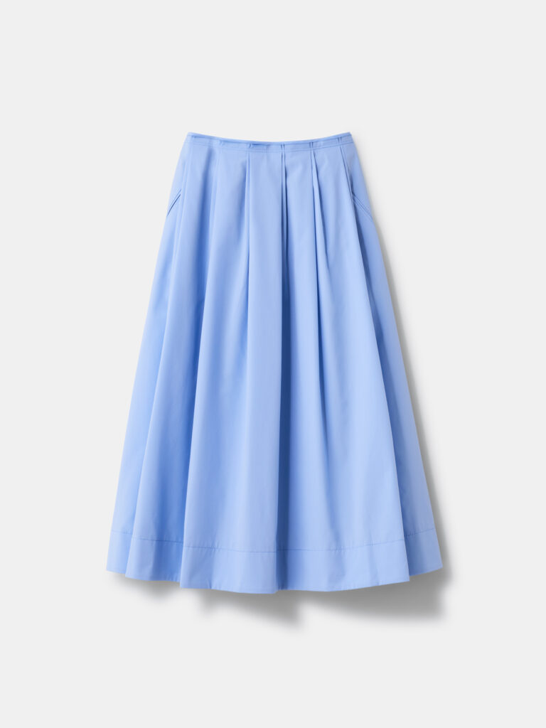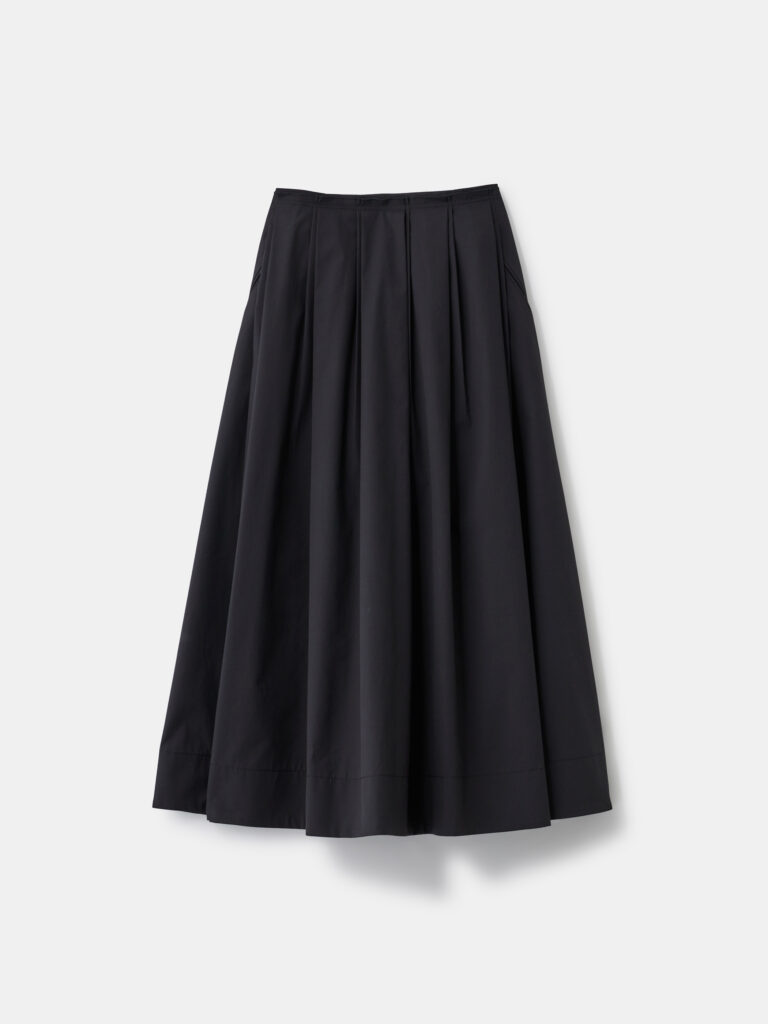「コットンブレンドダブルタックフレアスカート」は、ウエスト周りのタックデザインが特徴のミディ丈のスカートです。位置をずらして入れた2重のタックが奥行のあるシルエットをつくっています。両脇に斜めに入ったパイピングポケットがアクセントに。