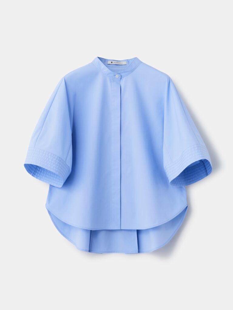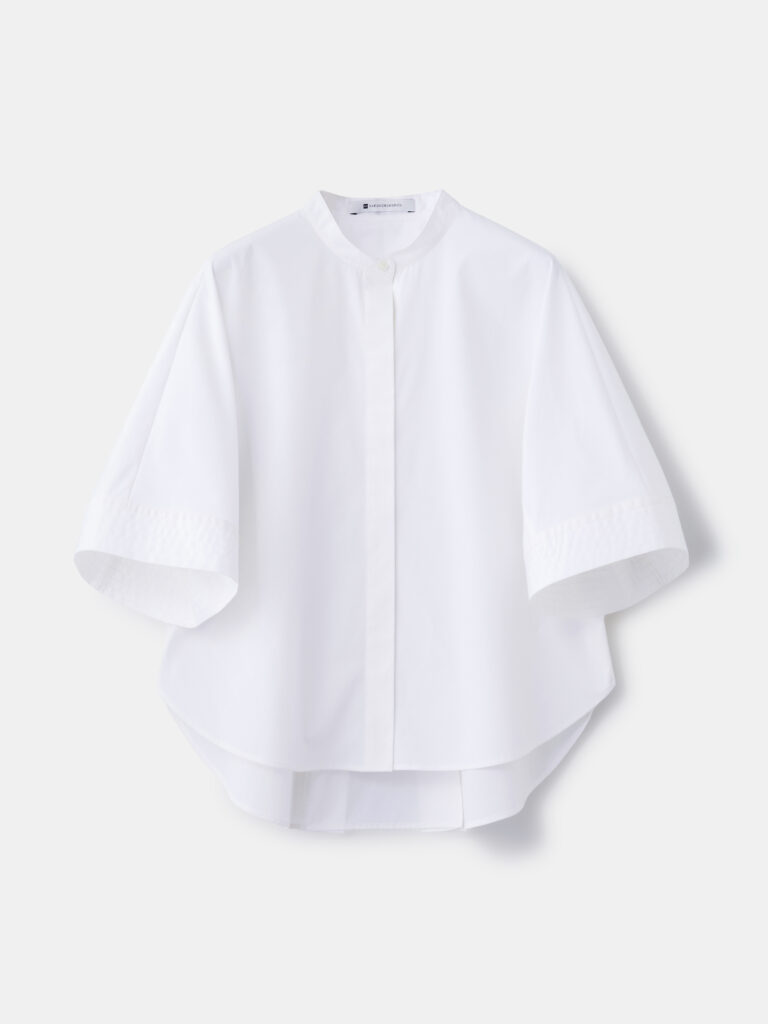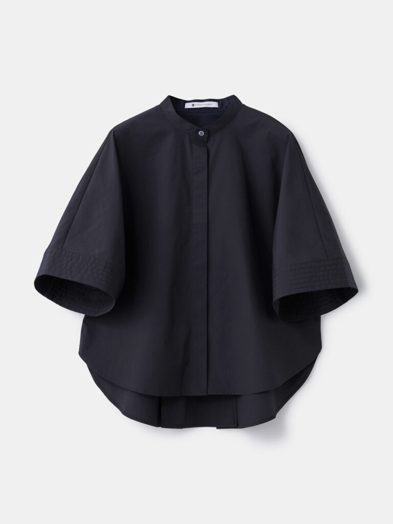 一枚で着映えする「コットンブレンドハーフスリーブシャツ」は、大胆なボリュームを持たせた袖が印象的。襟、カフス、袖の切り替え部分に微光沢のある太めの糸で入れたステッチがデザインのアクセントになっています。同素材のスカートとセットアップで着ると、エレガントな雰囲気に。
