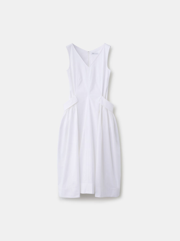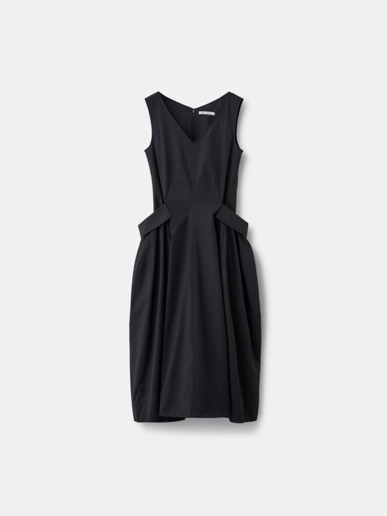体に沿う細身のシルエットと、たっぷりとしたボリューム感のコントラストが美しい「コットンブレンドノースリーブワンピース」。ダーツの取り方や切替えで縦長の印象をつくることで、スタイルアップが叶う一枚です。広く開いた胸元がデコルテを美しく見せてくれます。