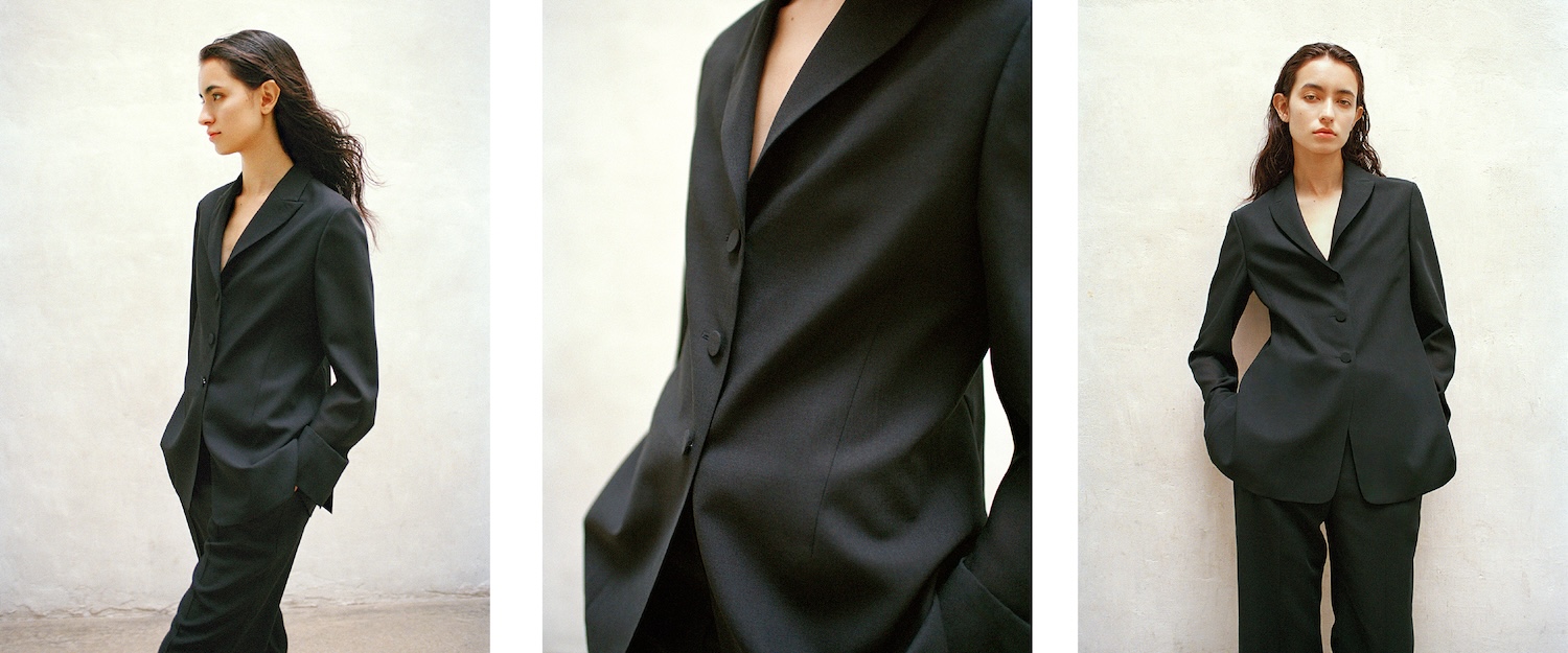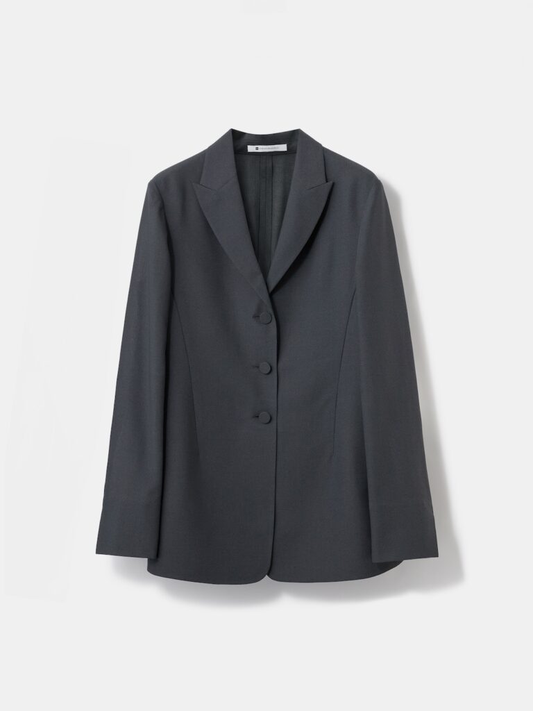 「ウールブレンドジャケット」は、斜めにダーツをとり、ウエストに程よく絞りを入れたバージャケットです。ボタンを高めの位置にすることでウエストラインを高く見せてくれる効果も。ミニマルなデザインはお仕事服としても着られるので、秋口からのスーツスタイルにもおすすめです。